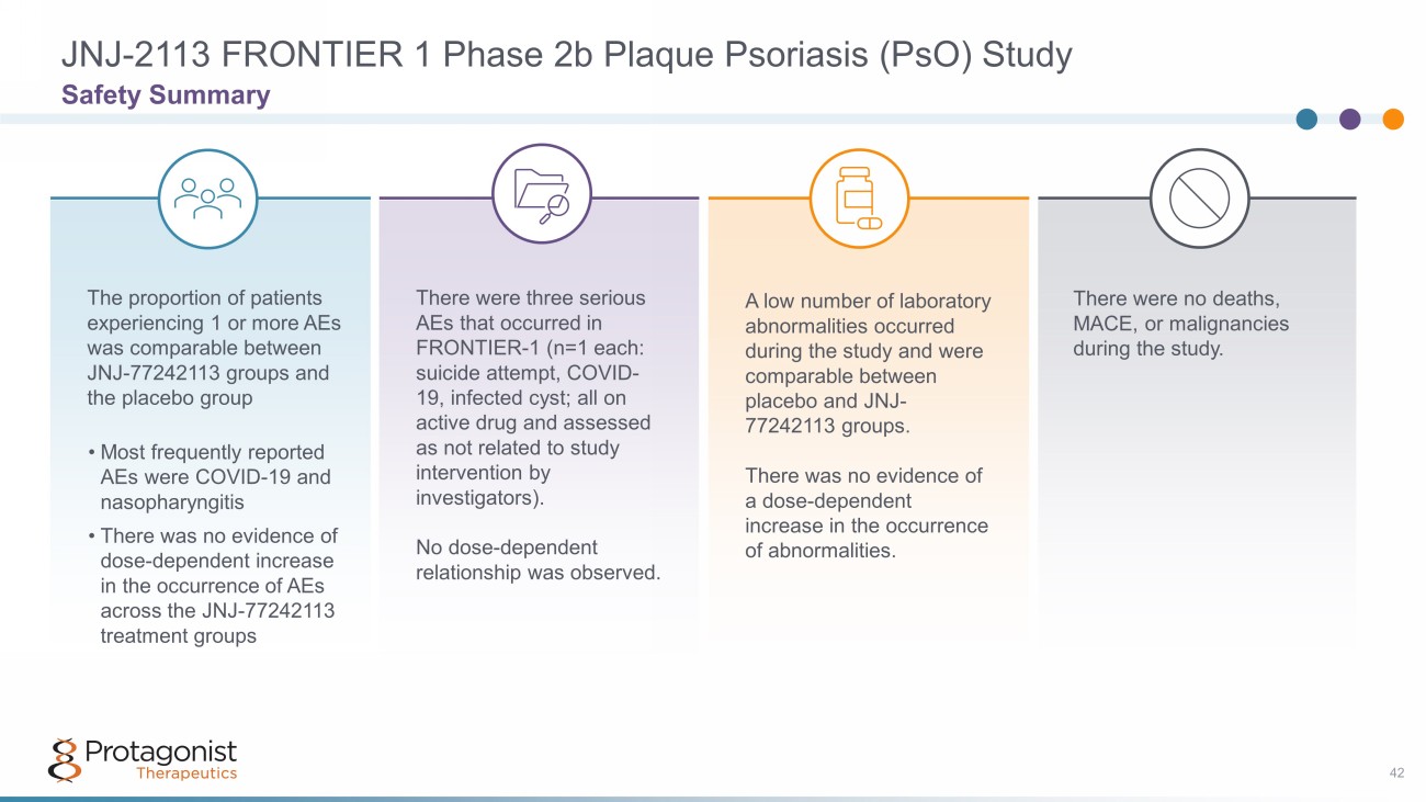 There were no deaths, MACE, or malignancies during the study. A low number of laboratory abnormalities occurred during the study and were comparable between placebo and JNJ - 77242113 groups. There was no evidence of a dose - dependent increase in the occurrence of abnormalities. There were three serious AEs that occurred in FRONTIER - 1 (n=1 each: suicide attempt, COVID - 19, infected cyst; all on active drug and assessed as not related to study intervention by investigators). No dose - dependent relationship was observed. The proportion of patients experiencing 1 or more AEs was comparable between JNJ - 77242113 groups and the placebo group • Most frequently reported AEs were COVID - 19 and nasopharyngitis • There was no evidence of dose - dependent increase in the occurrence of AEs across the JNJ - 77242113 treatment groups 42 Safety Summary JNJ - 2113 FRONTIER 1 Phase 2b Plaque Psoriasis (PsO) Study