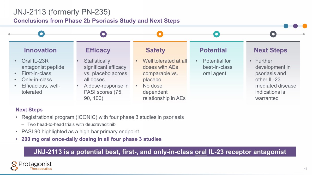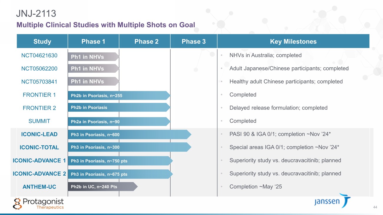 Study Phase 1 Phase 2 Phase 3 Key Milestones Ph2b in Psoriasis, n~255 JNJ - 2113 Multiple Clinical Studies with Multiple Shots on Goal • NHVs in Australia; completed • Adult Japanese/Chinese participants; completed • Healthy adult Chinese participants; completed • Completed • Delayed release formulation; completed • Completed • PASI 90 & IGA 0/1; completion ~Nov ’24* • Special areas IGA 0/1; completion ~Nov ’24* • Superiority study vs. deucravacitinib; planned • Superiority study vs. deucravacitinib; planned • Completion ~May ‘25 NCT04621630 NCT05062200 NCT05703841 FRONTIER 1 FRONTIER 2 SUMMIT ICONIC - LEAD ICONIC - TOTAL ICONIC - ADVANCE 1 ICONIC - ADVANCE 2 ANTHEM - UC Ph1 in NHVs Ph1 in NHVs Ph1 in NHVs Ph2b in Psoriasis Ph2a in Psoriasis, n~90 Ph3 in Psoriasis, n~600 Ph2b in UC, n~240 Pts Ph3 in Psoriasis, n~300 44 Ph3 in Psoriasis, n~750 pts Ph3 in Psoriasis, n~675 pts