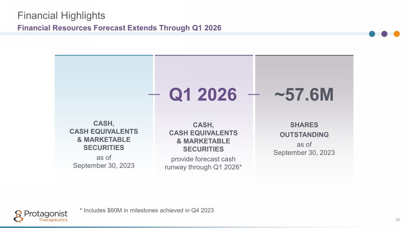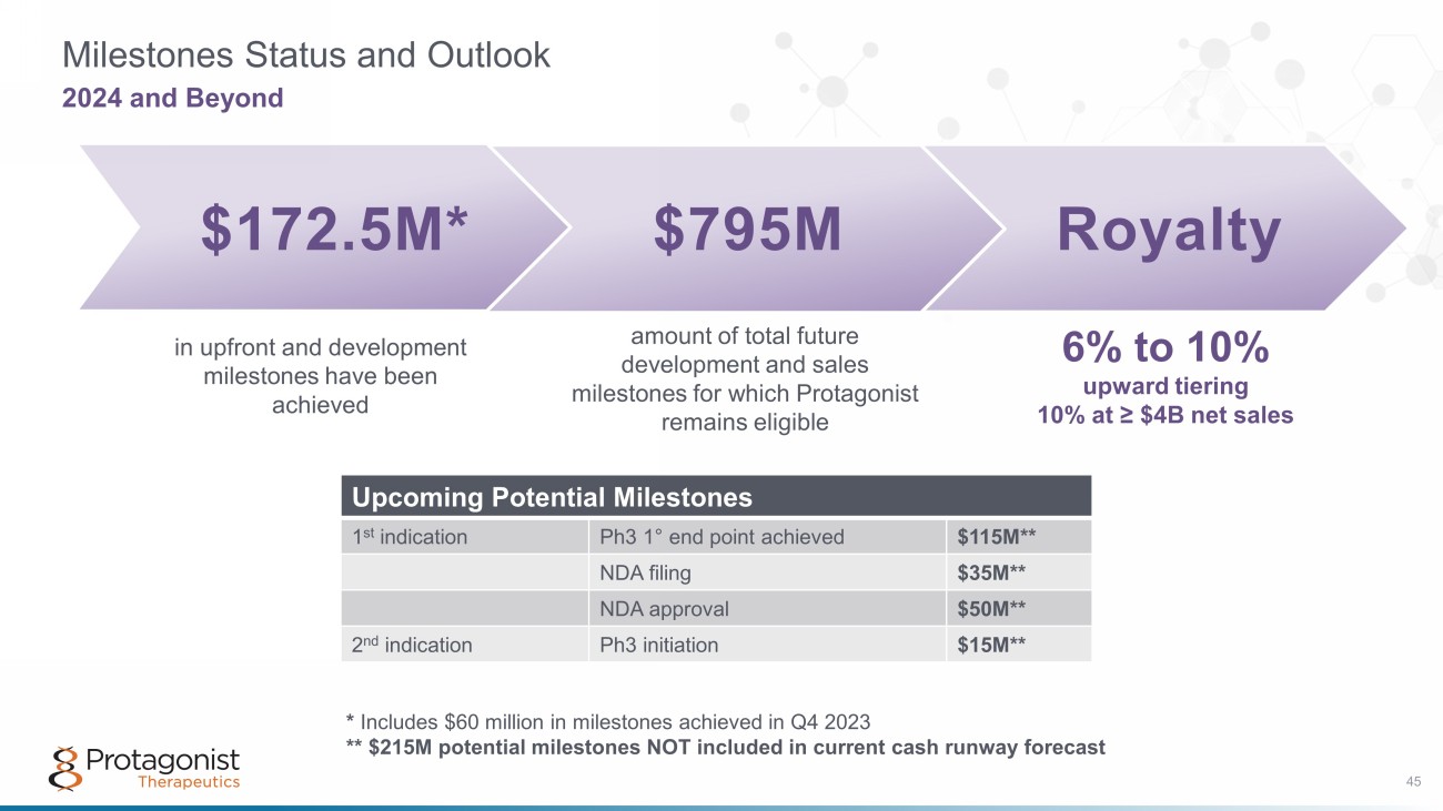 Royalty Milestones Status and Outlook 2024 and Beyond $172.5M* $795M amount of total future development and sales milestones for which Protagonist remains eligible in upfront and development milestones have been achieved 6% to 10% upward tiering 10% at ≥ $4B net sales Upcoming Potential Milestones 1 st indication Ph3 1 ° end point achieved $115M** NDA filing $35M** NDA approval $50M** 2 nd indication Ph3 initiation $15M** * Includes $60 million in milestones achieved in Q4 2023 ** $215M potential milestones NOT included in current cash runway forecast 45