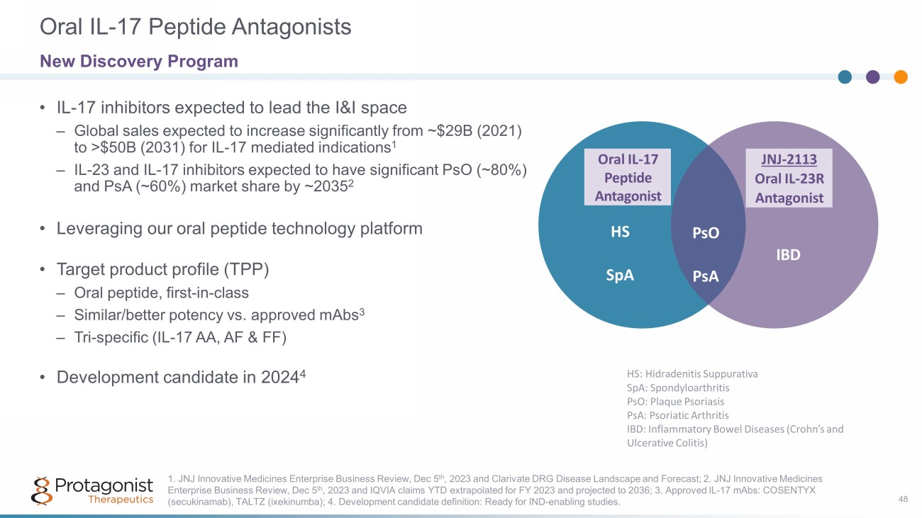 Discovery Pipeline 47 Leveraging Our Successes to Address Major Unmet Medical Needs and Create Value 1H 2024 1H 2024 Lead Optimization Dev Candidate Nomination Hematology Myeloproliferative Neoplasms I & I Inflammatory & Immunomodulatory Diseases • Leverage end - to - end expertise in MPNs • Build upon rusfertide MPN commercial franchise • Address unmet medical needs in MPNs; moving beyond rusfertide • Oral and/or parenteral routes of administration • Leverage the success of JNJ - 2113 • Next generation oral peptides with best - in - class efficacy/safety in systemic immune - mediated diseases • Validated clinical targets • Internal expertise/experience to move in competitive disease areas with strong differentiation 2H 2024 2H 2024 Focus Areas Strategic Rationale Oral IL - 17 Peptide Antagonists