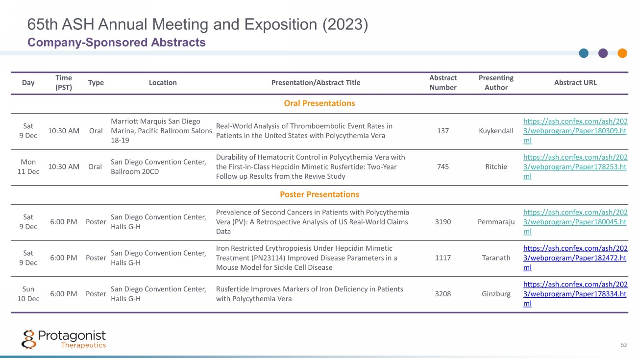 65th ASH Annual Meeting and Exposition (2023) 52 Company - Sponsored Abstracts Day Time (PST) Type Location Presentation/Abstract Title Abstract Number Presenting Author Abstract URL Oral Presentations Sat 9 Dec 10:30 AM Oral Marriott Marquis San Diego Marina, Pacific Ballroom Salons 18 - 19 Real - World Analysis of Thromboembolic Event Rates in Patients in the United States with Polycythemia Vera 137 Kuykendall https://ash.confex.com/ash/202 3/webprogram/Paper180309.ht ml Mon 11 Dec 10:30 AM Oral San Diego Convention Center, Ballroom 20CD Durability of Hematocrit Control in Polycythemia Vera with the First - in - Class Hepcidin Mimetic Rusfertide: Two - Year Follow up Results from the Revive Study 745 Ritchie https://ash.confex.com/ash/202 3/webprogram/Paper178253.ht ml Poster Presentations Sat 9 Dec 6:00 PM Poster San Diego Convention Center, Halls G - H Prevalence of Second Cancers in Patients with Polycythemia Vera (PV): A Retrospective Analysis of US Real - World Claims Data 3190 Pemmaraju https://ash.confex.com/ash/202 3/webprogram/Paper180045.ht ml Sat 9 Dec 6:00 PM Poster San Diego Convention Center, Halls G - H Iron Restricted Erythropoiesis Under Hepcidin Mimetic Treatment (PN23114) Improved Disease Parameters in a Mouse Model for Sickle Cell Disease 1117 Taranath https://ash.confex.com/ash/202 3/webprogram/Paper182472.ht ml Sun 10 Dec 6:00 PM Poster San Diego Convention Center, Halls G - H Rusfertide Improves Markers of Iron Deficiency in Patients with Polycythemia Vera 3208 Ginzburg https://ash.confex.com/ash/202 3/webprogram/Paper178334.ht ml