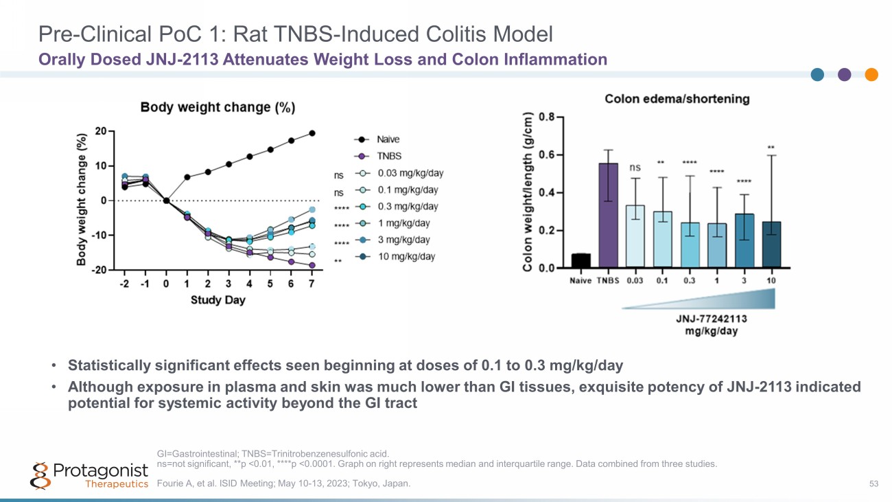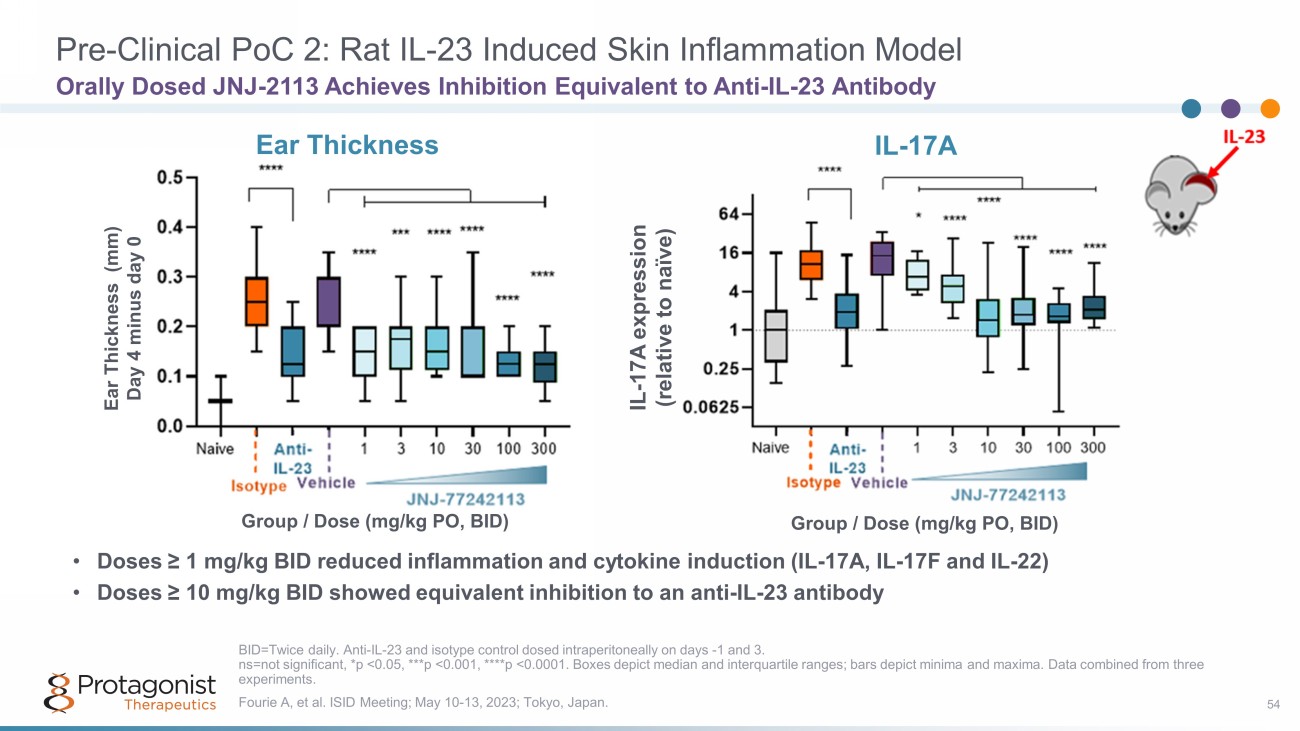 Pre - Clinical PoC 1: Rat TNBS - Induced Colitis Model 53 Orally Dosed JNJ - 2113 Attenuates Weight Loss and Colon Inflammation • Statistically significant effects seen beginning at doses of 0.1 to 0.3 mg/kg/day • Although exposure in plasma and skin was much lower than GI tissues, exquisite potency of JNJ - 2113 indicated potential for systemic activity beyond the GI tract Fourie A, et al. ISID Meeting; May 10 - 13, 2023; Tokyo, Japan. GI=Gastrointestinal; TNBS=Trinitrobenzenesulfonic acid. ns=not significant, **p <0.01, ****p <0.0001. Graph on right represents median and interquartile range. Data combined from th ree studies.