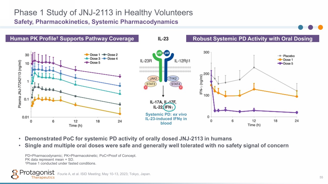 Pre - Clinical PoC 2: Rat IL - 23 Induced Skin Inflammation Model 54 Orally Dosed JNJ - 2113 Achieves Inhibition Equivalent to Anti - IL - 23 Antibody • Doses ≥ 1 mg/kg BID reduced inflammation and cytokine induction (IL - 17A, IL - 17F and IL - 22) • Doses ≥ 10 mg/kg BID showed equivalent inhibition to an anti - IL - 23 antibody Fourie A, et al. ISID Meeting; May 10 - 13, 2023; Tokyo, Japan. BID=Twice daily. Anti - IL - 23 and isotype control dosed intraperitoneally on days - 1 and 3. ns=not significant, *p <0.05, ***p <0.001, ****p <0.0001. Boxes depict median and interquartile ranges; bars depict minima an d m axima. Data combined from three experiments. Ear Thickness Ear Thickness (mm) Day 4 minus day 0 Group / Dose (mg/kg PO, BID) IL - 17A IL - 17A expression (relative to naïve) Group / Dose (mg/kg PO, BID)