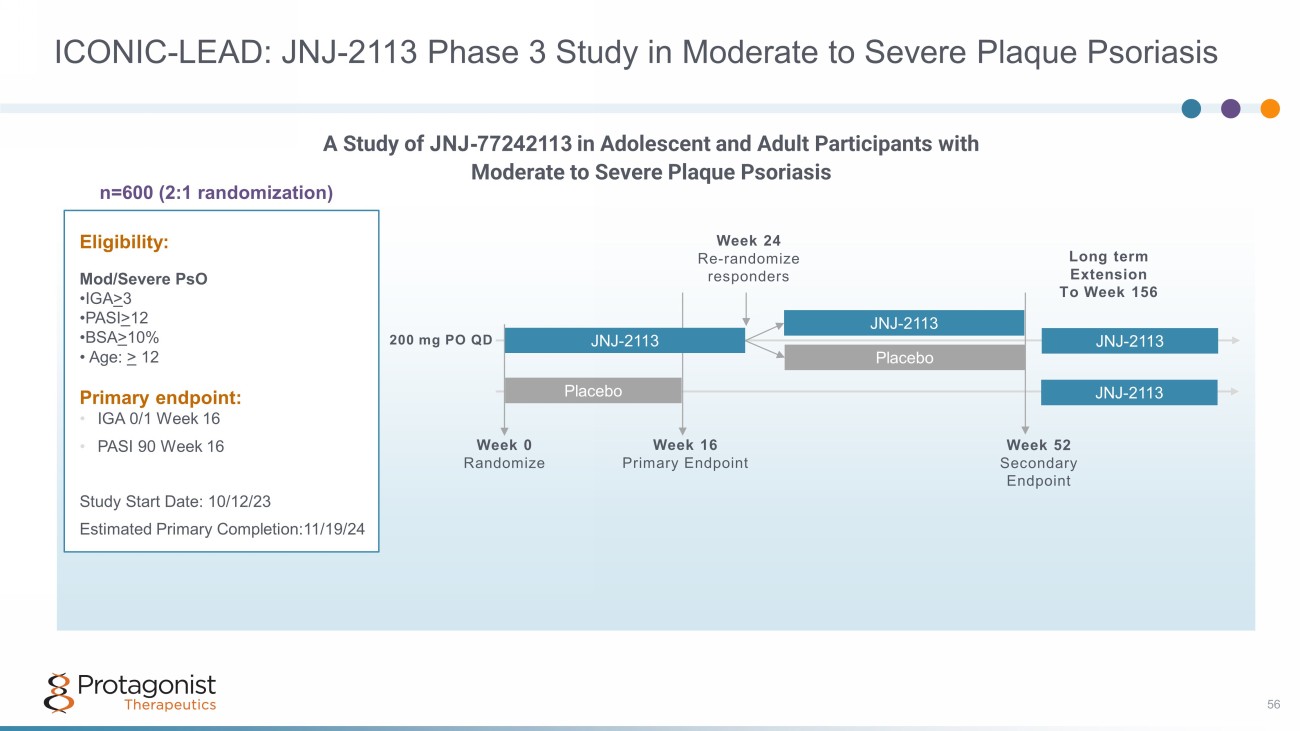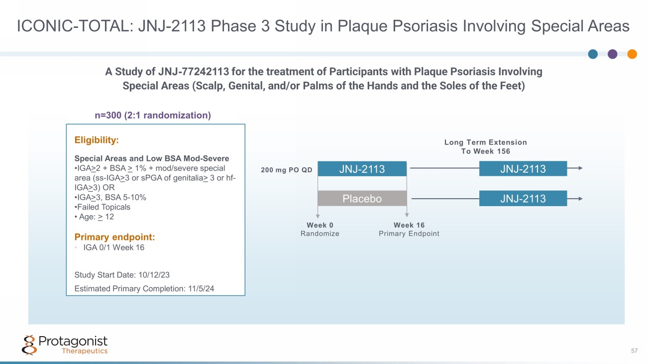 ICONIC - LEAD: JNJ - 2113 Phase 3 Study in Moderate to Severe Plaque Psoriasis 56 n=600 (2:1 randomization) Eligibility: Mod/Severe PsO • IGA > 3 • PASI > 12 • BSA > 10% • Age: > 12 Primary endpoint: • IGA 0/1 Week 16 • PASI 90 Week 16 Study Start Date: 10/12/23 Estimated Primary Completion:11/19/24 A Study of JNJ - 77242113 in Adolescent and Adult Participants with Moderate to Severe Plaque Psoriasis Week 0 Randomize Week 16 Primary Endpoint JNJ - 2113 JNJ - 2113 Placebo Placebo Week 52 Secondary Endpoint Week 24 Re - randomize responders JNJ - 2113 JNJ - 2113 Long term Extension To Week 156 200 mg PO QD