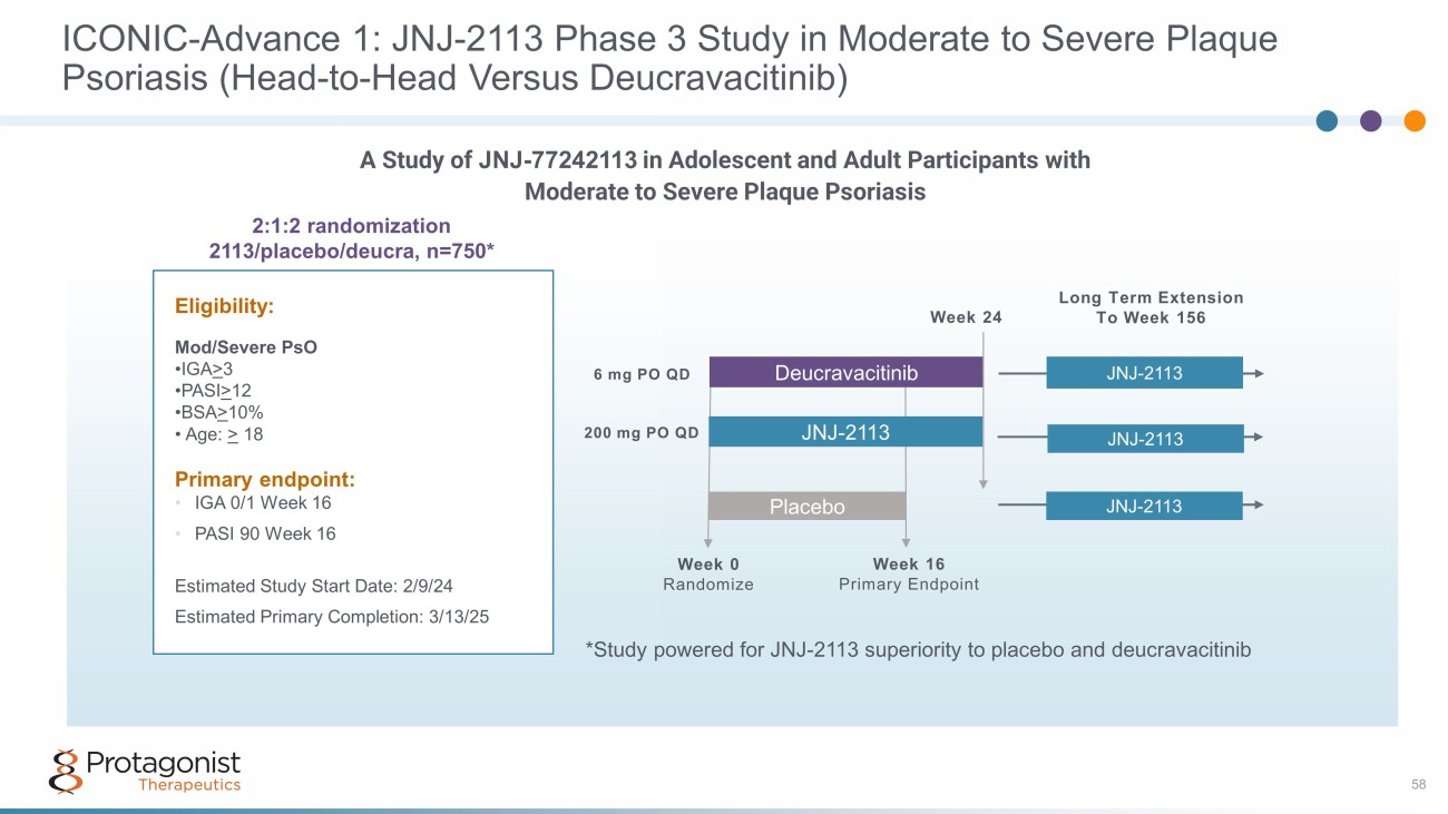 ICONIC - TOTAL: JNJ - 2113 Phase 3 Study in Plaque Psoriasis Involving Special Areas 57 n=300 (2:1 randomization) Eligibility: Special Areas and Low BSA Mod - Severe • IGA > 2 + BSA > 1% + mod/severe special area (ss - IGA > 3 or sPGA of genitalia > 3 or hf - IGA > 3) OR • IGA > 3, BSA 5 - 10% • Failed Topicals • Age: > 12 Primary endpoint: • IGA 0/1 Week 16 Study Start Date: 10/12/23 Estimated Primary Completion: 11/5/24 A Study of JNJ - 77242113 for the treatment of Participants with Plaque Psoriasis Involving Special Areas (Scalp, Genital, and/or Palms of the Hands and the Soles of the Feet) Week 0 Randomize Week 16 Primary Endpoint JNJ - 2113 Placebo JNJ - 2113 JNJ - 2113 Long Term Extension To Week 156 200 mg PO QD
