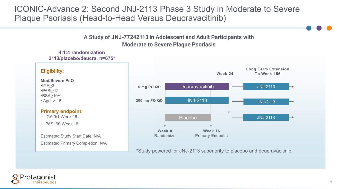 58 2:1:2 randomization 2113/placebo/deucra, n=750* Eligibility: Mod/Severe PsO • IGA > 3 • PASI > 12 • BSA > 10% • Age: > 18 Primary endpoint: • IGA 0/1 Week 16 • PASI 90 Week 16 Estimated Study Start Date: 2/9/24 Estimated Primary Completion: 3/13/25 Week 0 Randomize Week 16 Primary Endpoint Placebo JNJ - 2113 JNJ - 2113 Long Term Extension To Week 156 Deucravacitinib Week 24 JNJ - 2113 JNJ - 2113 6 mg PO QD 200 mg PO QD *Study powered for JNJ - 2113 superiority to placebo and deucravacitinib A Study of JNJ - 77242113 in Adolescent and Adult Participants with Moderate to Severe Plaque Psoriasis ICONIC - Advance 1: JNJ - 2113 Phase 3 Study in Moderate to Severe Plaque Psoriasis (Head - to - Head Versus Deucravacitinib)