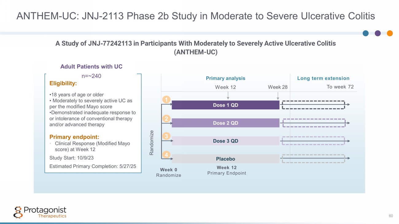 ANTHEM - UC: JNJ - 2113 Phase 2b Study in Moderate to Severe Ulcerative Colitis 60 Adult Patients with UC n=~240 Eligibility: • 18 years of age or older • Moderately to severely active UC as per the modified Mayo score • Demonstrated inadequate response to or intolerance of conventional therapy and/or advanced therapy Primary endpoint: • Clinical Response (Modified Mayo score) at Week 12 Study Start: 10/9/23 Estimated Primary Completion: 5/27/25 Primary analysis Long term extension To week 72 Week 12 Dose 1 QD Dose 2 QD Dose 3 QD Placebo Week 0 Randomize Week 12 Primary Endpoint Randomize 2 1 3 4 A Study of JNJ - 77242113 in Participants With Moderately to Severely Active Ulcerative Colitis (ANTHEM - UC) Week 28