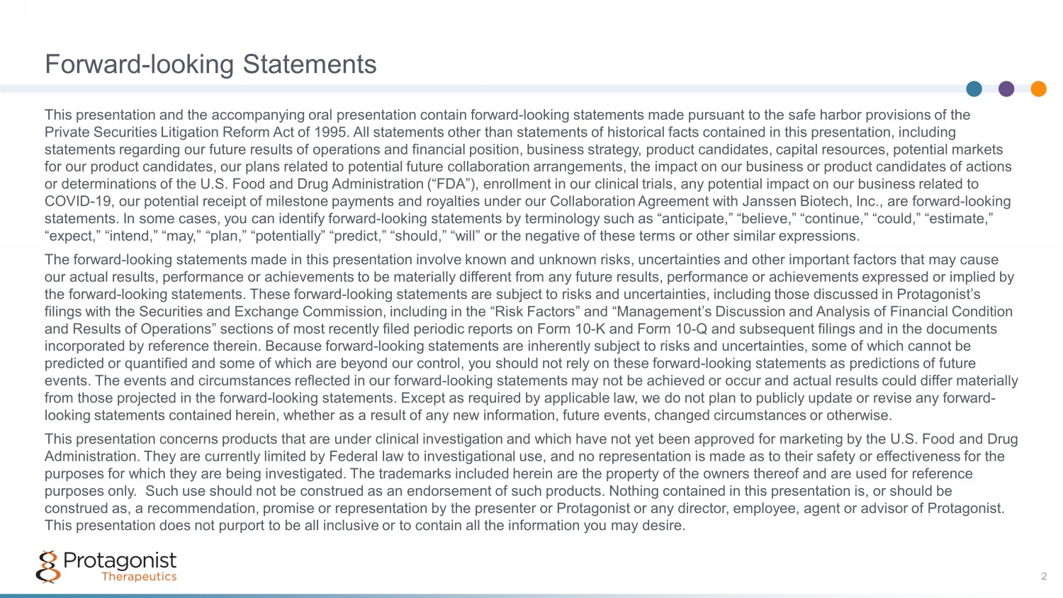 Forward - looking Statements 2 This presentation and the accompanying oral presentation contain forward - looking statements made pursuant to the safe harbor pro visions of the Private Securities Litigation Reform Act of 1995. All statements other than statements of historical facts contained in this pre sentation, including statements regarding our future results of operations and financial position, business strategy, product candidates, capital res ources, potential markets for our product candidates, our plans related to potential future collaboration arrangements, the impact on our business or p rod uct candidates of actions or determinations of the U.S. Food and Drug Administration (“FDA”), enrollment in our clinical trials, any potential impact o n o ur business related to COVID - 19, our potential receipt of milestone payments and royalties under our Collaboration Agreement with Janssen Biotech, Inc. , are forward - looking statements. In some cases, you can identify forward - looking statements by terminology such as “anticipate,” “believe,” “continue ,” “could,” “estimate,” “expect,” “intend,” “may,” “plan,” “potentially” “predict,” “should,” “will” or the negative of these terms or other similar exp ressions. The forward - looking statements made in this presentation involve known and unknown risks, uncertainties and other important fact ors that may cause our actual results, performance or achievements to be materially different from any future results, performance or achievemen ts expressed or implied by the forward - looking statements. These forward - looking statements are subject to risks and uncertainties, including those discuss ed in Protagonist’s filings with the Securities and Exchange Commission, including in the “Risk Factors” and “Management’s Discussion and Analysi s o f Financial Condition and Results of Operations” sections of most recently filed periodic reports on Form 10 - K and Form 10 - Q and subsequent filings an d in the documents incorporated by reference therein. Because forward - looking statements are inherently subject to risks and uncertainties, some of which cannot be predicted or quantified and some of which are beyond our control, you should not rely on these forward - looking statements as pre dictions of future events. The events and circumstances reflected in our forward - looking statements may not be achieved or occur and actual results could differ materially from those projected in the forward - looking statements. Except as required by applicable law, we do not plan to publicly update or revise any forward - looking statements contained herein, whether as a result of any new information, future events, changed circumstances or othe rwi se. This presentation concerns products that are under clinical investigation and which have not yet been approved for marketing by the U.S. Food and Drug Administration. They are currently limited by Federal law to investigational use, and no representation is made as to their s afe ty or effectiveness for the purposes for which they are being investigated. The trademarks included herein are the property of the owners thereof and are us ed for reference purposes only. Such use should not be construed as an endorsement of such products. Nothing contained in this presentation i s, or should be construed as, a recommendation, promise or representation by the presenter or Protagonist or any director, employee, agent or ad visor of Protagonist. This presentation does not purport to be all inclusive or to contain all the information you may desire.