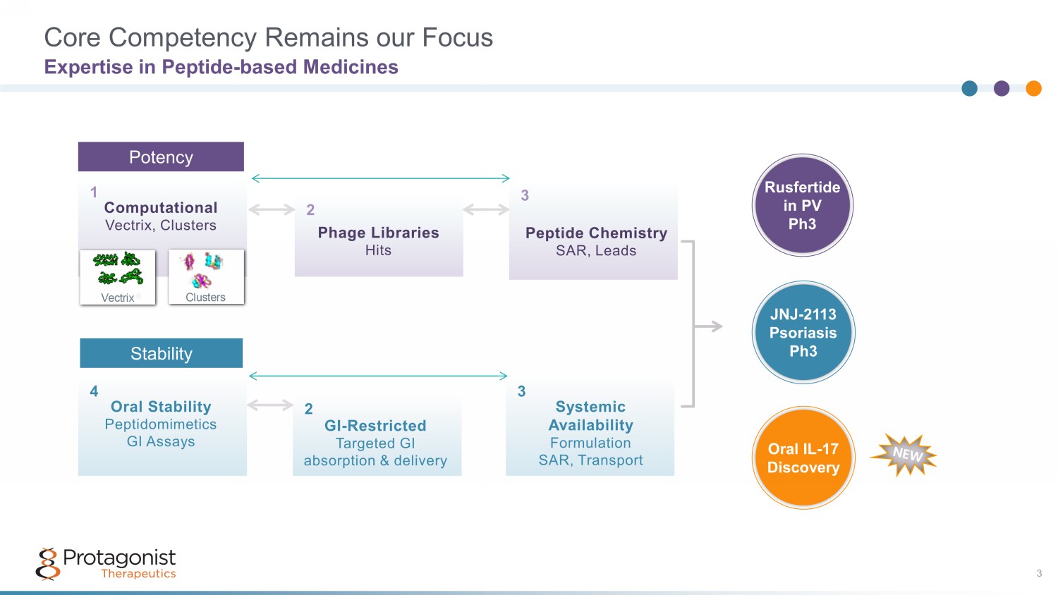 Core Competency Remains our Focus Expertise in Peptide - based Medicines Potency Peptide Chemistry SAR, Leads Phage Libraries Hits Computational Vectrix, Clusters Vectrix ® Clusters 1 2 3 POTENCY Oral Stability Peptidomimetics GI Assays GI-Restricted Targeted GI absorption & delivery Systemic Availability Formulation SAR, Transport 4 5 6 STABILITY Computational Vectrix , Clusters 1 Peptide Chemistry SAR, Leads Phage Libraries Hits Computational Vectrix, Clusters Vectrix ® Clusters 1 2 3 POTENCY Oral Stability Peptidomimetics GI Assays GI-Restricted Targeted GI absorption & delivery Systemic Availability Formulation SAR, Transport 4 5 6 STABILITY Peptide Chemistry SAR, Leads 3 Phage Libraries Hits 2 Stability Oral Stability Peptidomimetics GI Assays 4 Systemic Availability Formulation SAR, Transport 3 GI - Restricted Targeted GI absorption & delivery 2 JNJ - 2113 h3 3 JNJ - 2113 Psoriasis Ph3 Rusfertide in PV Ph3 Oral IL - 17 Discovery
