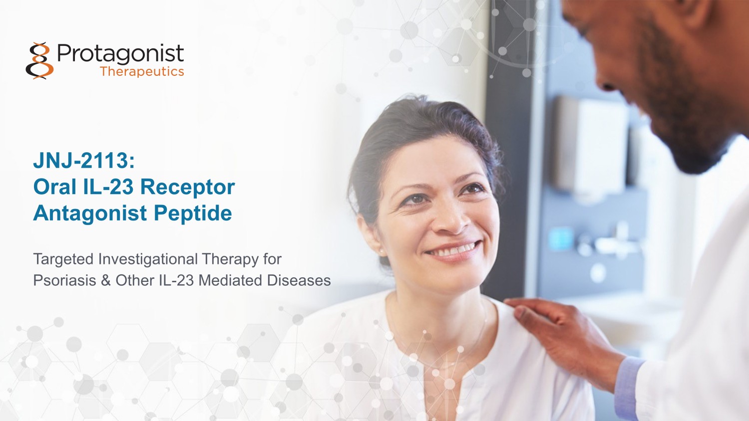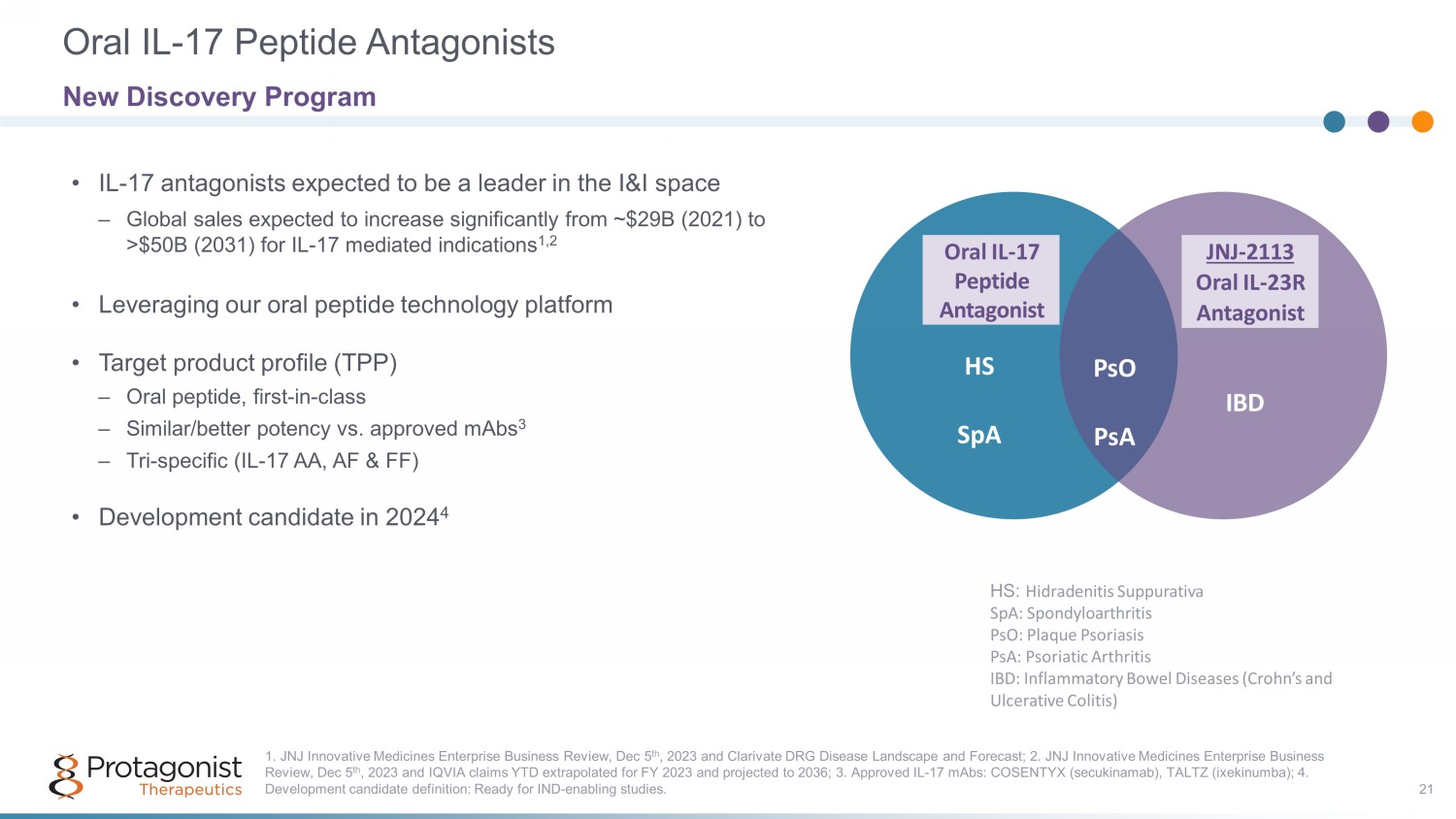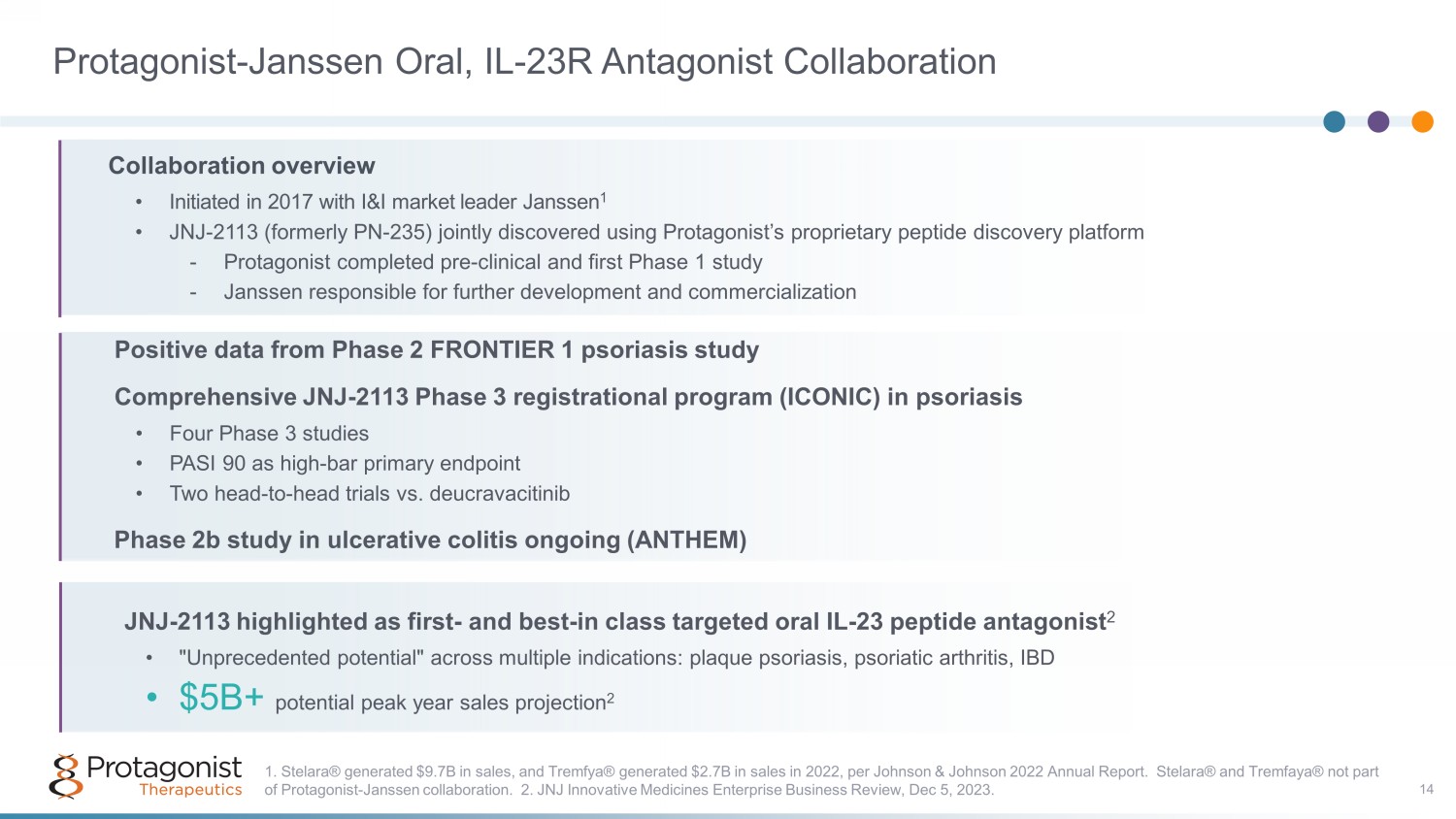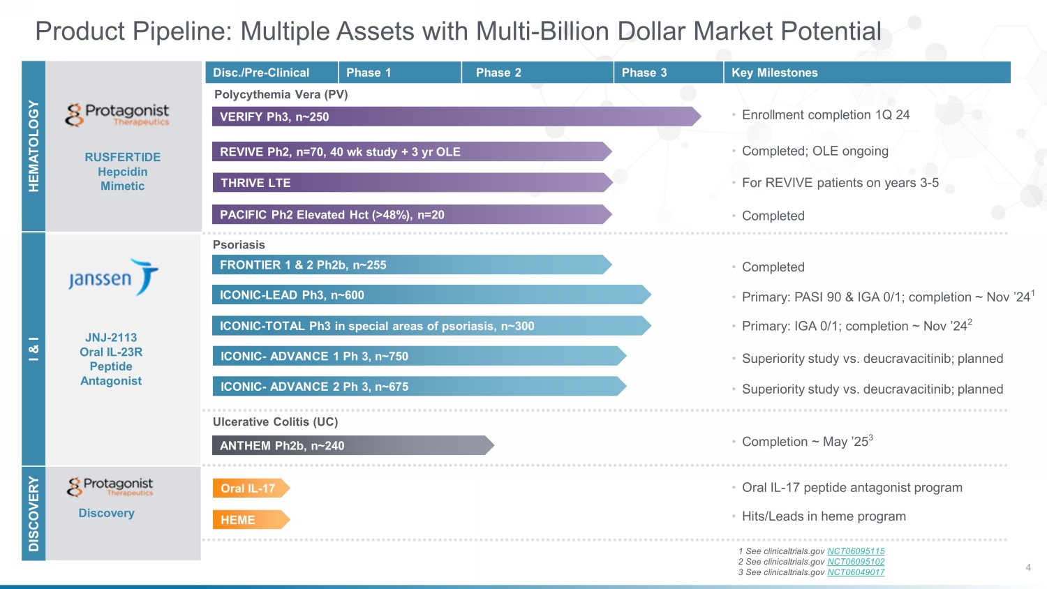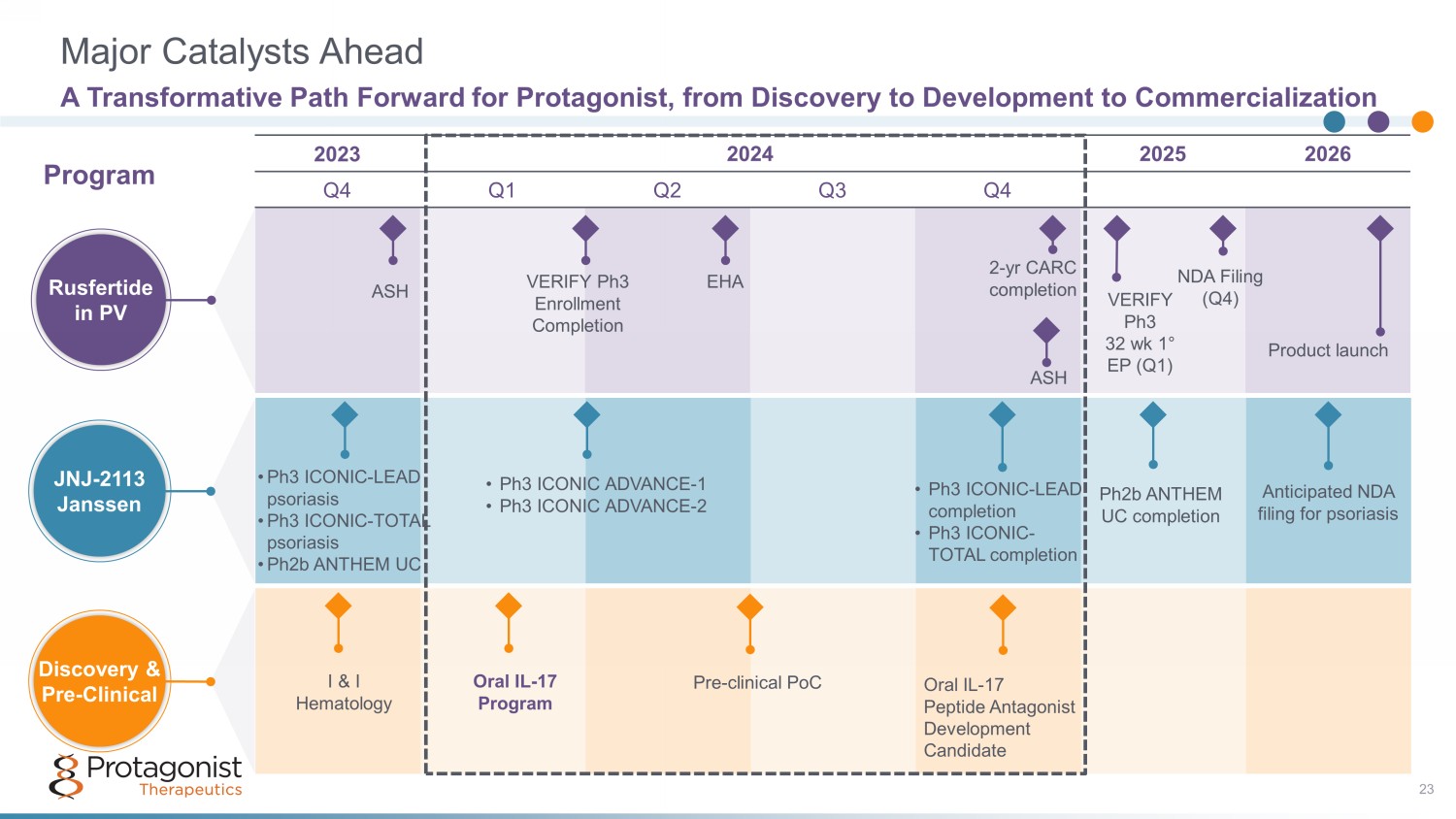 2023 2024​ 2025​ 2026​ Q4​ Q1​ Q2​ Q3​ Q4​ ​ ​ ​ ​ ​ ​ ​ ​ ​ ​ ​ ​ ​ ​ ​ ​ ​ ​ ​ ​ ​ ASH JNJ - 2113 Janssen Major Catalysts Ahead A Transformative Path Forward for Protagonist, from Discovery to Development to Commercialization Program Rusfertide in PV JNJ - 2113 Janssen Discovery & Pre - Clinical 23 VERIFY Ph3 Enrollment Completion EHA 2 - yr CARC completion VERIFY Ph3 32 wk 1 ° EP (Q1) NDA Filing (Q4) Product launch • Ph3 ICONIC - LEAD psoriasis • Ph3 ICONIC - TOTAL psoriasis • Ph2b ANTHEM UC • Ph3 ICONIC ADVANCE - 1 • Ph3 ICONIC ADVANCE - 2 Ph2b ANTHEM UC completion Anticipated NDA filing for psoriasis • Ph3 ICONIC - LEAD completion • Ph3 ICONIC - TOTAL completion I & I Hematology Oral IL - 17 Program Pre - clinical PoC Oral IL - 17 Peptide Antagonist Development Candidate ASH