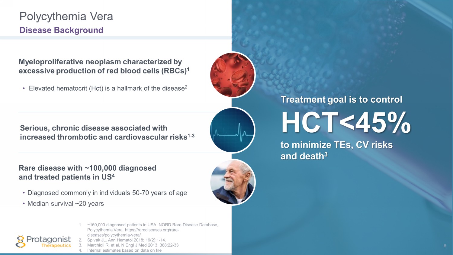 Myeloproliferative neoplasm characterized by excessive production of red blood cells ( RBCs) 1 Treatment goal is to control HCT <45% to minimize TEs, CV risks and death 3 • Elevated hematocrit ( Hct ) is a hallmark of the disease 2 Serious, chronic disease associated with increased thrombotic and cardiovascular risks 1 - 3 Rare disease with ~100,000 diagnosed and treated patients in US 4 • Diagnosed commonly in individuals 50 - 70 years of age • Median survival ~20 years Polycythemia Vera Disease Background 1. ~160,000 diagnosed patients in USA. NORD Rare Disease Database, Polycythemia Vera. https:// rarediseases.org /rare - diseases/polycythemia - vera/ 2. Spivak JL. Ann Hematol 2018; 19(2):1 - 14. 3. Marchioli R, et al. N Engl J Med 2013; 368:22 - 33 4. Internal estimates based on data on file 6