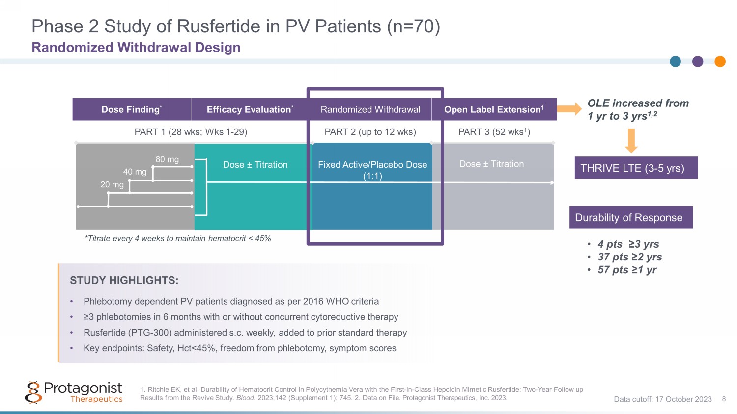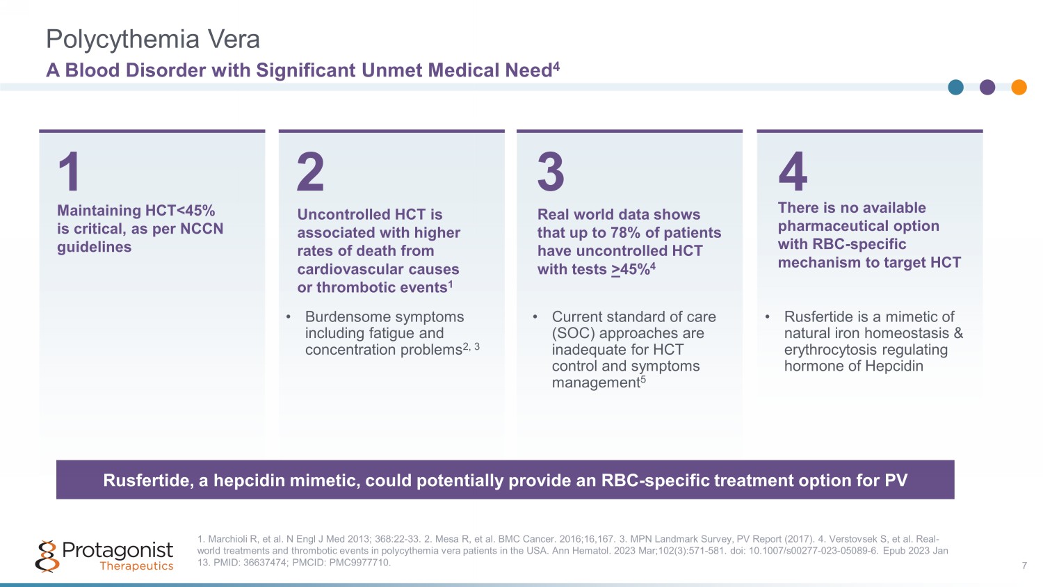 4 3 2 Polycythemia Vera 7 • Burdensome symptoms including fatigue and concentration problems 2, 3 A Blood Disorder with Significant Unmet Medical Need 4 Uncontrolled HCT is associated with higher rates of death from cardiovascular causes or thrombotic events 1 Real world data shows that up to 78% of patients have uncontrolled HCT with tests > 45% 4 • Current standard of care (SOC) approaches are inadequate for HCT control and symptoms management 5 There is no available pharmaceutical option with RBC - specific mechanism to target HCT • Rusfertide is a mimetic of natural iron homeostasis & erythrocytosis regulating hormone of Hepcidin 1. Marchioli R, et al. N Engl J Med 2013; 368:22 - 33. 2. Mesa R, et al. BMC Cancer. 2016;16,167. 3. MPN Landmark Survey, PV Report (2017). 4. Verstovsek S, et al. Real - world treatments and thrombotic events in polycythemia vera patients in the USA. Ann Hematol. 2023 Mar;102(3):571 - 581. doi : 10.1007/s00277 - 023 - 05089 - 6. Epub 2023 Jan 13. PMID: 36637474; PMCID: PMC9977710. Maintaining HCT<45% is critical, as per NCCN guidelines 1 Rusfertide , a hepcidin mimetic, could potentially provide an RBC - specific treatment option for PV