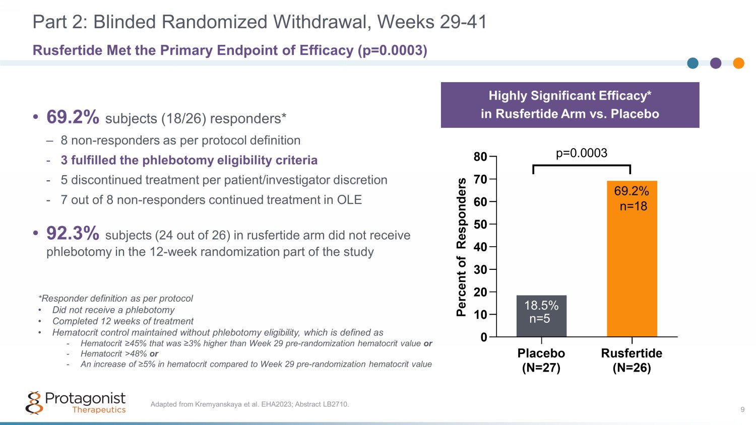 Dose Finding * Efficacy Evaluation * Randomized Withdrawal Open Label Extension 1 PART 1 (28 wks ; Wks 1 - 29) PART 2 (up to 12 wks ) PART 3 (52 wks 1 ) STUDY HIGHLIGHTS: • Phlebotomy dependent PV patients diagnosed as per 2016 WHO criteria • ≥3 phlebotomies in 6 months with or without concurrent cytoreductive therapy • Rusfertide (PTG - 300) administered s.c. weekly, added to prior standard therapy • Key endpoints: Safety, Hct <45%, freedom from phlebotomy, symptom scores Dose ± Titration Fixed Active/Placebo Dose (1:1) Dose ± Titration *Titrate every 4 weeks to maintain hematocrit < 45% 20 mg 40 mg 80 mg OLE increased from 1 yr to 3 yrs 1,2 • 4 pts ≥3 yrs • 37 pts ≥2 yrs • 57 pts ≥1 yr 1. Ritchie EK, et al. Durability of Hematocrit Control in Polycythemia Vera with the First - in - Class Hepcidin Mimetic Rusfertide: T wo - Year Follow up Results from the Revive Study. Blood . 2023;142 (Supplement 1): 745. 2. Data on File. Protagonist Therapeutics, Inc. 2023. Phase 2 Study of Rusfertide in PV Patients (n=70) Randomized Withdrawal Design 8 Data cutoff: 17 October 2023 Durability of Response THRIVE LTE (3 - 5 yrs )
