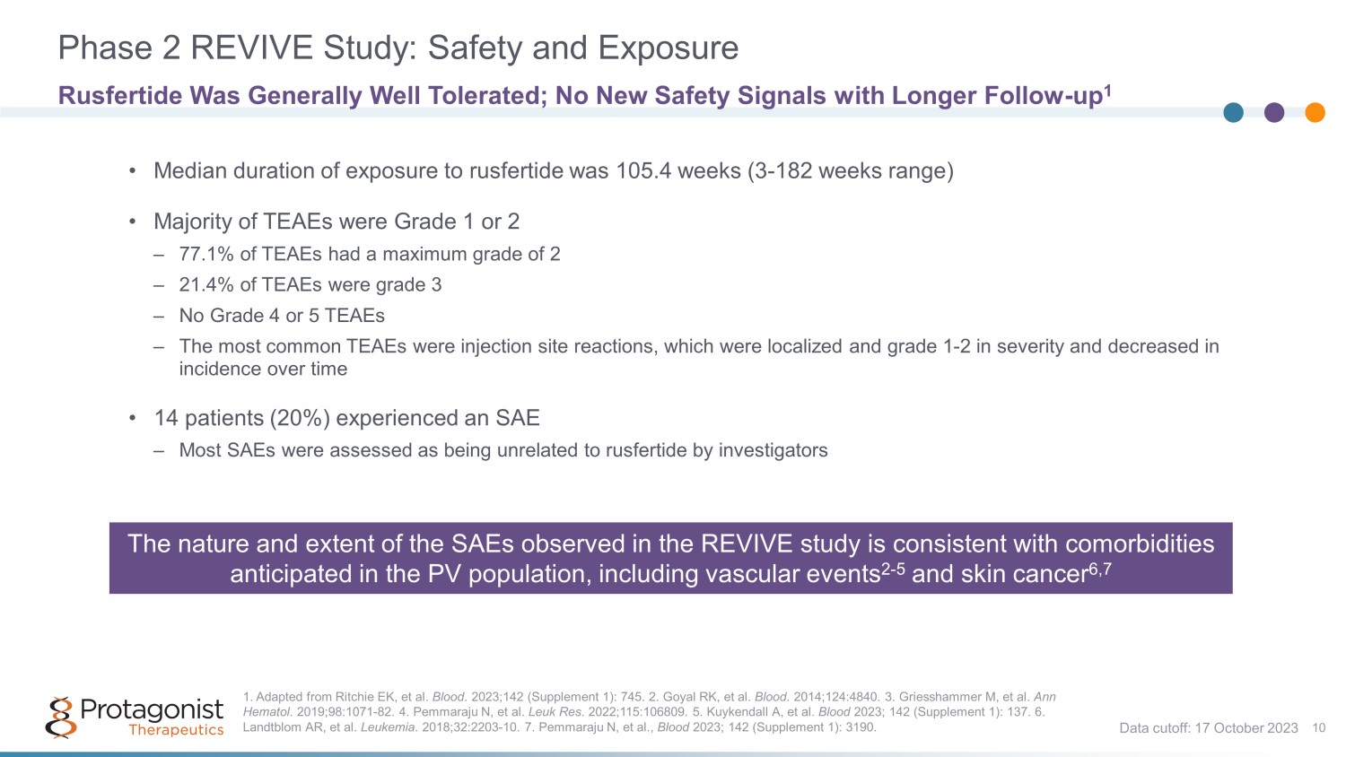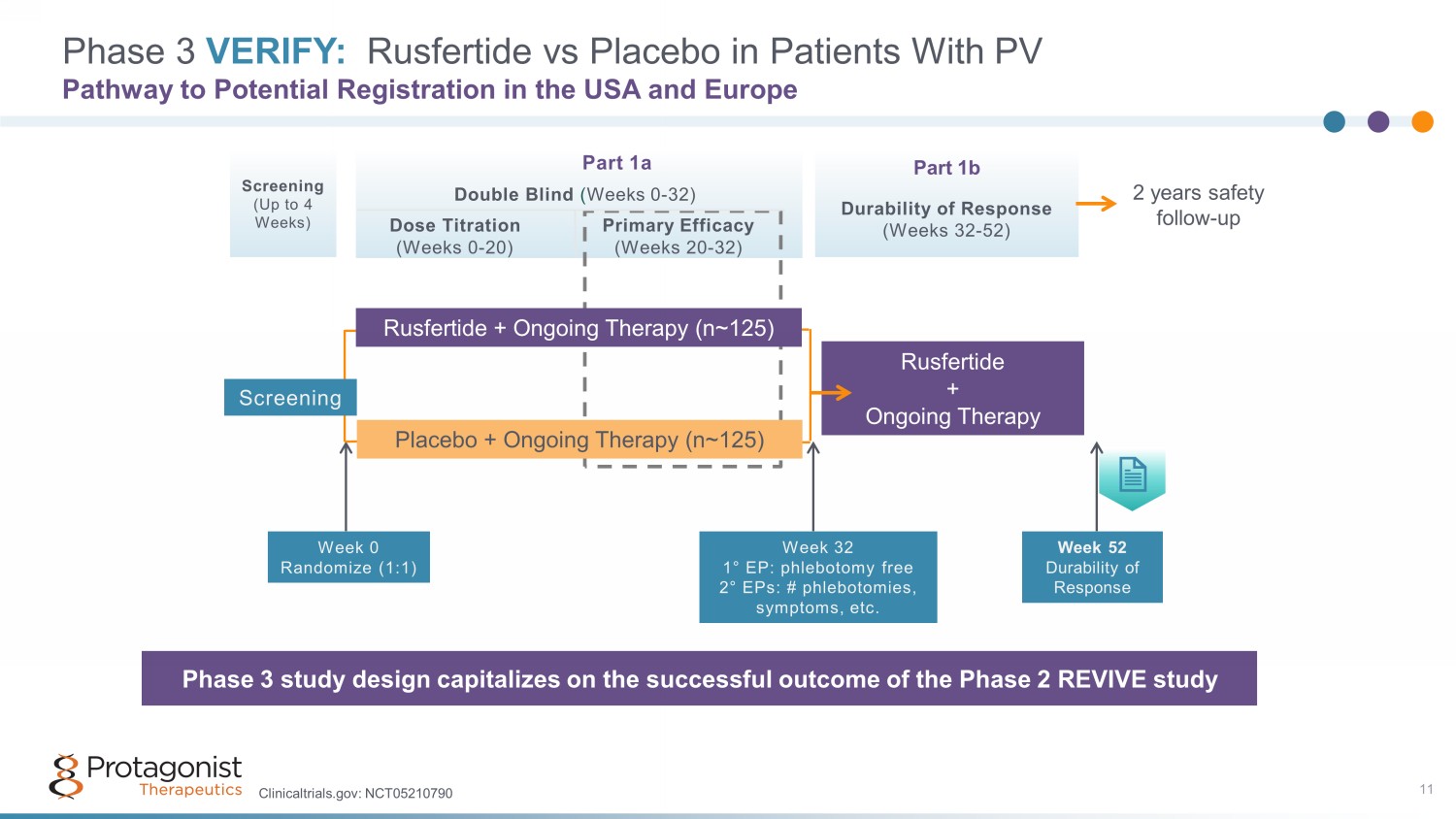 Phase 2 REVIVE Study: Safety and Exposure 10 Rusfertide Was Generally Well Tolerated; No New Safety Signals with Longer Follow - up 1 The nature and extent of the SAEs observed in the REVIVE study is consistent with comorbidities anticipated in the PV population, including vascular events 2 - 5 and skin cancer 6,7 Data cutoff: 17 October 2023 • Median duration of exposure to rusfertide was 105.4 weeks (3 - 182 weeks range) • Majority of TEAEs were Grade 1 or 2 – 77.1% of TEAEs had a maximum grade of 2 – 21.4% of TEAEs were grade 3 – No Grade 4 or 5 TEAEs – The most common TEAEs were injection site reactions, which were localized and grade 1 - 2 in severity and decreased in incidence over time • 14 patients (20%) experienced an SAE – Most SAEs were assessed as being unrelated to rusfertide by investigators 1. Adapte d from Ritchie EK, et al. Blood . 2023;142 (Supplement 1): 745. 2. Goyal RK, et al. Blood . 2014;124:4840. 3. Griesshammer M, et al. Ann Hematol . 2019;98:1071 - 82. 4. Pemmaraju N, et al. Leuk Res . 2022;115:106809. 5. Kuykendall A, et al. Blood 2023; 142 (Supplement 1): 137. 6. Landtblom AR, et al. Leukemia . 2018;32:2203 - 10. 7 . Pemmaraju N, et al., Blood 2023; 142 (Supplement 1): 3190.