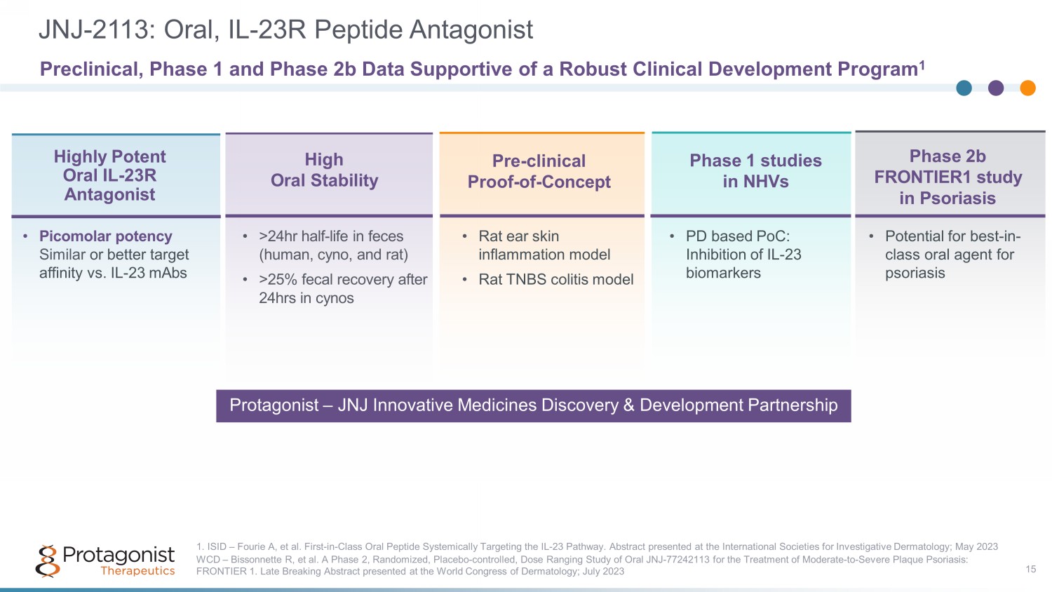 Protagonist - Janssen Oral, IL - 23R Antagonist Collaboration 14 JNJ - 2113 highlighted as f irst - and best - in class targeted oral IL - 23 peptide antagonist 2 • "Unprecedented potential" across multiple indications: plaque psoriasis, psoriatic arthritis, IBD • $5B+ p otential peak year sales projection 2 Collaboration overview • Initiated in 2017 with I&I market leader Janssen 1 • JNJ - 2113 (formerly PN - 235) jointly discovered using Protagonist’s proprietary peptide discovery platform - Protagonist completed pre - clinical and first Phase 1 study - Janssen responsible for further development and commercialization Positive data from Phase 2 FRONTIER 1 psoriasis study Comprehensive JNJ - 2113 Phase 3 registrational program (ICONIC) in psoriasis • Four Phase 3 studies • PASI 90 as high - bar primary endpoint • Two head - to - head trials vs. deucravacitinib Phase 2b study in ulcerative colitis ongoing (ANTHEM) 1. Stelara® generated $9.7B in sales, and Tremfya® generated $2.7B in sales in 2022, per Johnson & Johnson 2022 Annual Report. Ste lara® and Tremfaya ® not part of Protagonist - Janssen collaboration. 2. JNJ Innovative Medicines Enterprise Business Review, Dec 5, 2023.