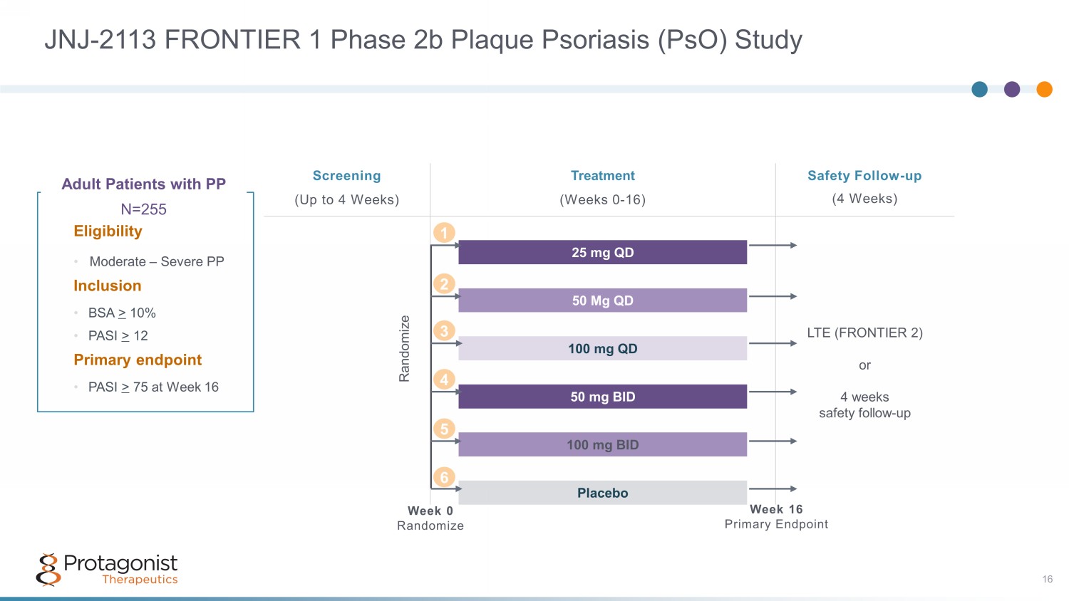 JNJ - 2113: Oral, IL - 23R Peptide Antagonist 15 Preclinical, Phase 1 and Phase 2b Data Supportive of a Robust Clinical Development Program 1 1. ISID – Fourie A, et al. First - in - Class Oral Peptide Systemically Targeting the IL - 23 Pathway. Abstract presented at the Inter national Societies for Investigative Dermatology; May 2023 WCD – Bissonnette R, et al. A Phase 2, Randomized, Placebo - controlled, Dose Ranging Study of Oral JNJ - 77242113 for the Treatment of Moderate - to - Severe Plaque Psoriasis: FRONTIER 1. Late Breaking Abstract presented at the World Congress of Dermatology; July 2023 • >24hr half - life in feces (human, cyno , and rat) • >25% fecal recovery after 24hrs in cynos • Rat ear skin inflammation model • Rat TNBS colitis model Pre - clinical Proof - of - Concept High O ral Stability Highly Potent O ral IL - 23R A ntagonist • Picomolar potency Similar or better target affinity vs. IL - 23 mAbs Phase 1 studies in NHVs Phase 2b FRONTIER1 study in Psoriasis • PD based PoC: Inhibition of IL - 23 biomarkers • Potential for best - in - class oral agent for psoriasis Protagonist – JNJ Innovative Medicines Discovery & Development Partnership