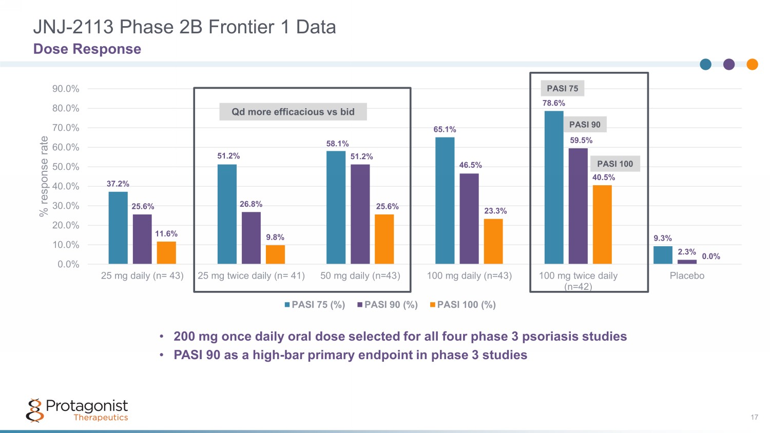 JNJ - 2113 FRONTIER 1 Phase 2b Plaque Psoriasis ( PsO ) Study Adult Patients with PP N=255 Eligibility • Moderate – Severe PP Inclusion • BSA > 10% • PASI > 12 Primary endpoint • PASI > 75 at Week 16 Screening Treatment Safety Follow - up (4 Weeks) (Up to 4 Weeks) (Weeks 0 - 16) 25 mg QD LTE (FRONTIER 2) or 4 weeks safety follow - up 50 Mg QD 100 mg QD 50 mg BID 100 mg BID Placebo Week 0 Randomize Week 16 Primary Endpoint Randomize 2 1 3 4 5 6 16