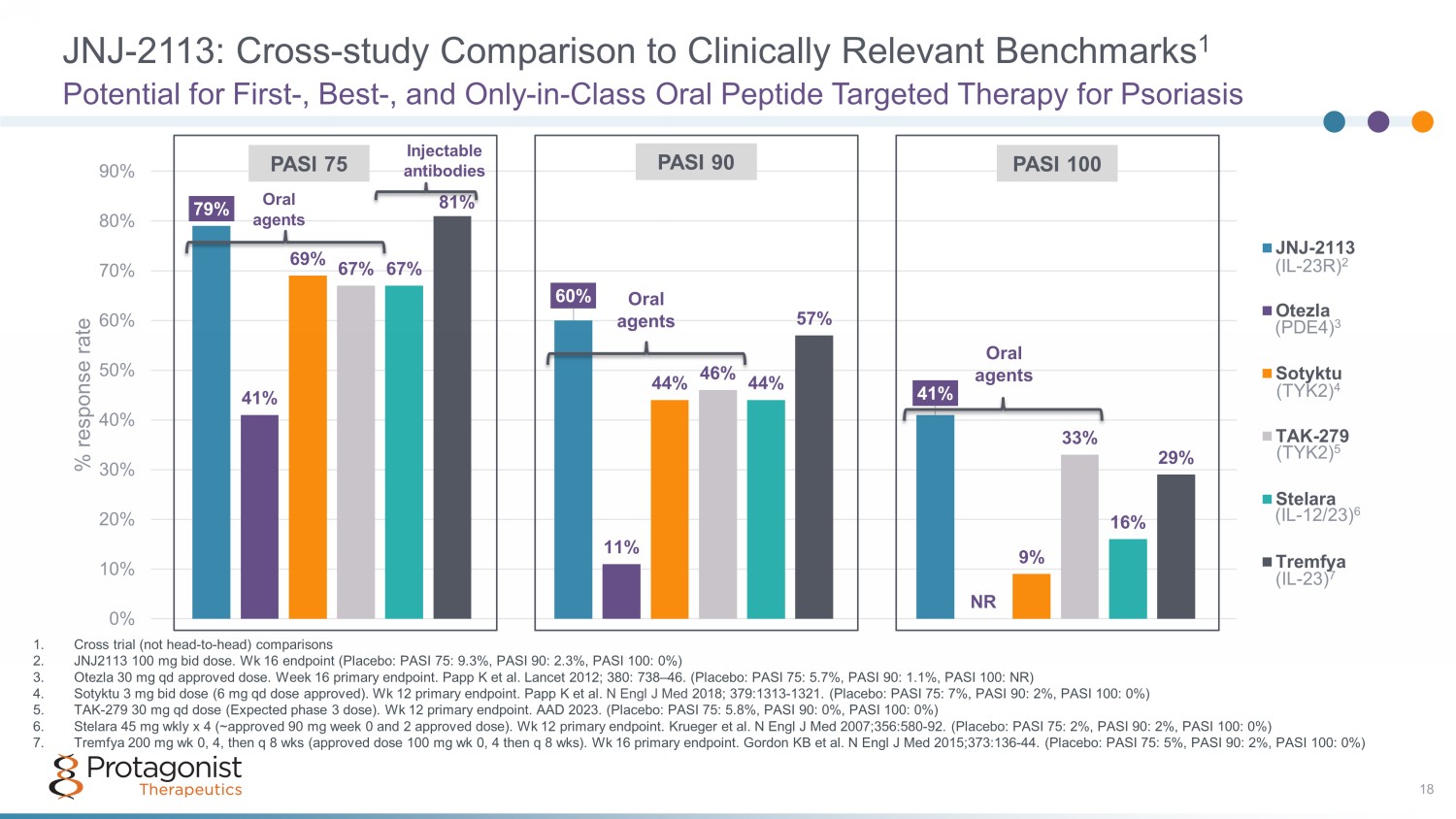 JNJ - 2113 Phase 2B Frontier 1 Data 37.2% 51.2% 58.1% 65.1% 78.6% 9.3% 25.6% 26.8% 51.2% 46.5% 59.5% 2.3% 11.6% 9.8% 25.6% 23.3% 40.5% 0.0% 0.0% 10.0% 20.0% 30.0% 40.0% 50.0% 60.0% 70.0% 80.0% 90.0% 25 mg daily (n= 43) 25 mg twice daily (n= 41) 50 mg daily (n=43) 100 mg daily (n=43) 100 mg twice daily (n=42) Placebo % response rate PASI 75 (%) PASI 90 (%) PASI 100 (%) Dose Response • 200 mg once daily oral dose selected for all four phase 3 psoriasis studies • PASI 90 as a high - bar primary endpoint in phase 3 studies 17 PASI 90 PASI 75 PASI 100 Qd more efficacious vs bid