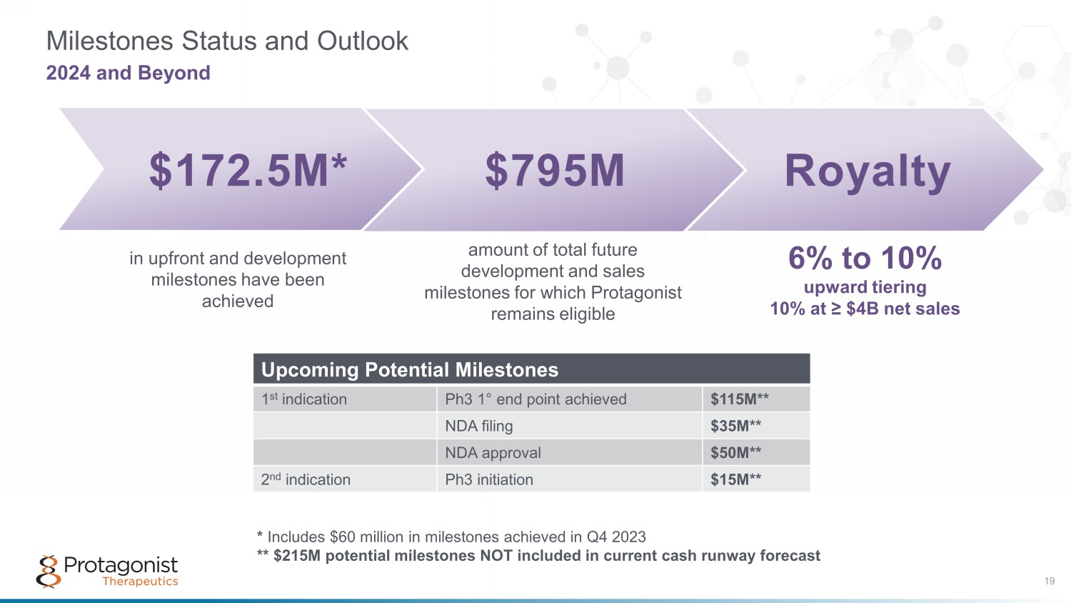 Royalty Milestones Status and Outlook 2024 and Beyond $172.5M* $795M amount of total future development and sales milestones for which Protagonist remains eligible in upfront and development milestones have been achieved 6% to 10% upward tiering 10% at ≥ $4B net sales Upcoming Potential Milestones 1 st indication Ph3 1 ° end point achieved $115M** NDA filing $35M** NDA approval $50M** 2 nd indication Ph3 initiation $15M** * Includes $60 million in milestones achieved in Q4 2023 ** $215M potential milestones NOT included in current cash runway forecast 19