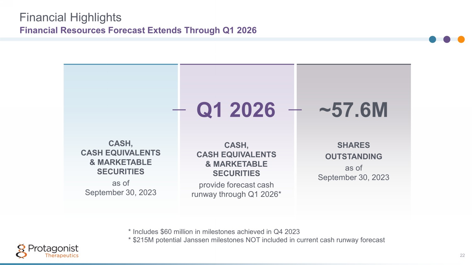 Financial Highlights Financial Resources Forecast Extends Through Q1 2026 CASH, CASH EQUIVALENTS & MARKETABLE SECURITIES provide forecast cash runway through Q1 2026* SHARES OUTSTANDING as of September 30, 2023 Q1 2026 ~57.6M CASH, CASH EQUIVALENTS & MARKETABLE SECURITIES as of September 30, 2023 22 * Includes $60 million in milestones achieved in Q4 2023 * $215M potential Janssen milestones NOT included in current cash runway forecast