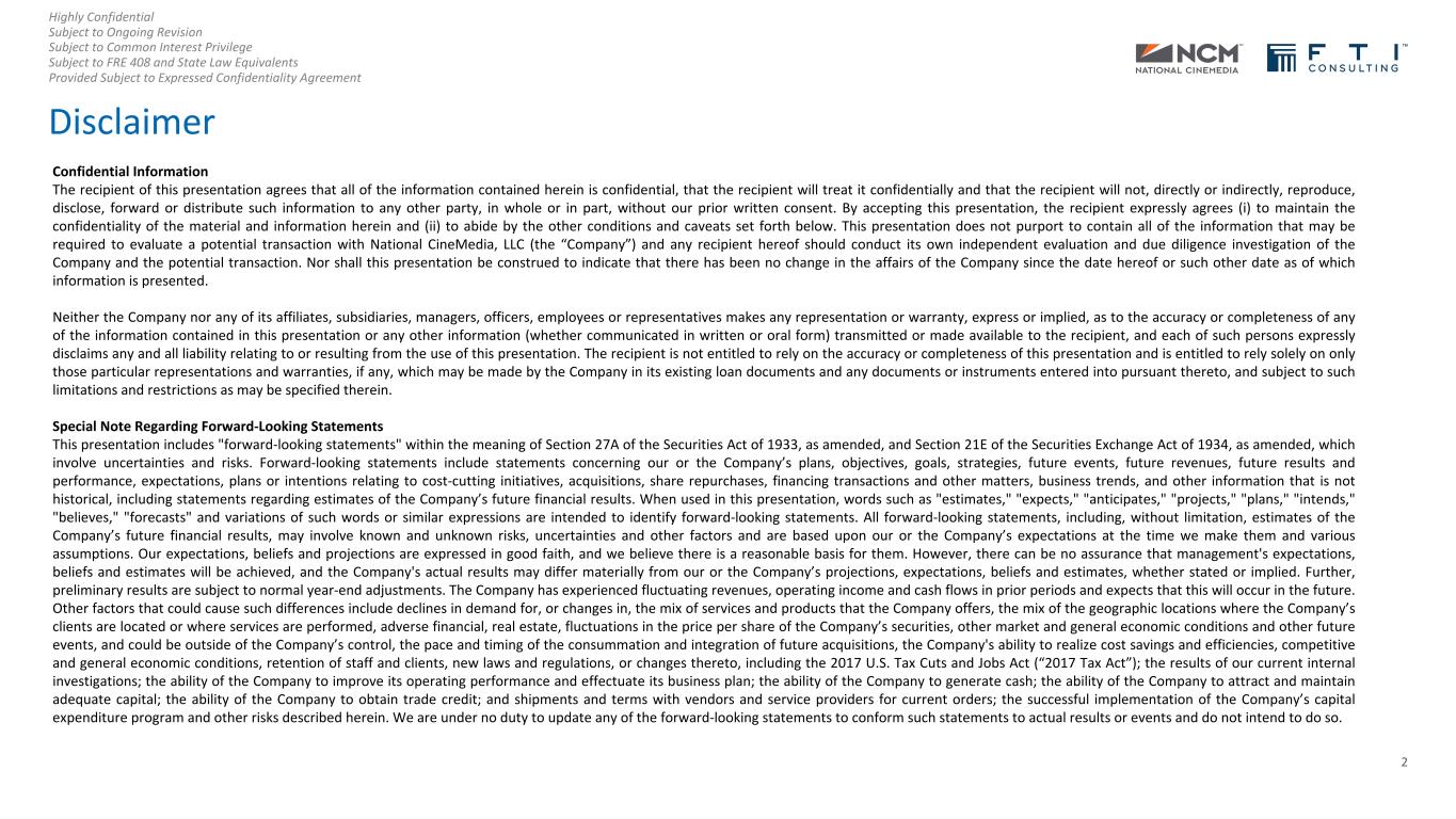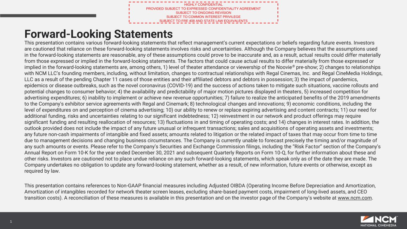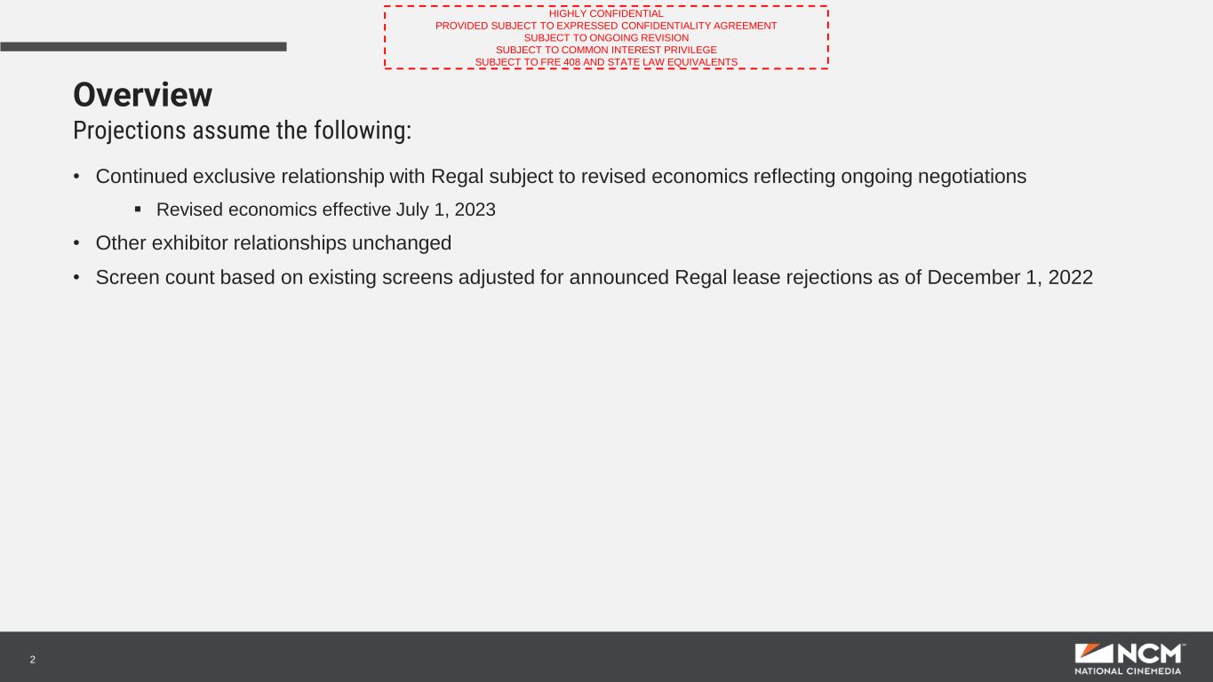 HIGHLY CONFIDENTIAL PROVIDED SUBJECT TO EXPRESSED CONFIDENTIALITY AGREEMENT SUBJECT TO ONGOING REVISION SUBJECT TO COMMON INTEREST PRIVILEGE SUBJECT TO FRE 408 AND STATE LAW EQUIVALENTS Forward-Looking Statements This presentation contains various forward-looking statements that reflect management’s current expectations or beliefs regarding future events. Investors are cautioned that reliance on these forward-looking statements involves risks and uncertainties. Although the Company believes that the assumptions used in the forward-looking statements are reasonable, any of these assumptions could prove to be inaccurate and, as a result, actual results could differ materially from those expressed or implied in the forward-looking statements. The factors that could cause actual results to differ materially from those expressed or implied in the forward-looking statements are, among others, 1) level of theater attendance or viewership of the Noovie® pre-show; 2) changes to relationships with NCM LLC’s founding members, including, without limitation, changes to contractual relationships with Regal Cinemas, Inc. and Regal CineMedia Holdings, LLC as a result of the pending Chapter 11 cases of those entities and their affiliated debtors and debtors in possession; 3) the impact of pandemics, epidemics or disease outbreaks, such as the novel coronavirus (COVID-19) and the success of actions taken to mitigate such situations, vaccine rollouts and potential changes to consumer behavior; 4) the availability and predictability of major motion pictures displayed in theaters, 5) increased competition for advertising expenditures; 6) inability to implement or achieve new revenue opportunities; 7) failure to realize the anticipated benefits of the 2019 amendments to the Company's exhibitor service agreements with Regal and Cinemark; 8) technological changes and innovations; 9) economic conditions, including the level of expenditures on and perception of cinema advertising; 10) our ability to renew or replace expiring advertising and content contracts; 11) our need for additional funding, risks and uncertainties relating to our significant indebtedness; 12) reinvestment in our network and product offerings may require significant funding and resulting reallocation of resources; 13) fluctuations in and timing of operating costs; and 14) changes in interest rates. In addition, the outlook provided does not include the impact of any future unusual or infrequent transactions; sales and acquisitions of operating assets and investments; any future non-cash impairments of intangible and fixed assets; amounts related to litigation or the related impact of taxes that may occur from time to time due to management decisions and changing business circumstances. The Company is currently unable to forecast precisely the timing and/or magnitude of any such amounts or events. Please refer to the Company’s Securities and Exchange Commission filings, including the “Risk Factor” section of the Company’s Annual Report on Form 10-K for the year ended December 30, 2021 and subsequent Quarterly Reports on Form 10-Q, for further information about these and other risks. Investors are cautioned not to place undue reliance on any such forward-looking statements, which speak only as of the date they are made. The Company undertakes no obligation to update any forward-looking statement, whether as a result, of new information, future events or otherwise, except as required by law. This presentation contains references to Non-GAAP financial measures including Adjusted OIBDA (Operating Income Before Depreciation and Amortization, Amortization of intangibles recorded for network theater screen leases, excluding share-based payment costs, impairment of long-lived assets, and CEO transition costs). A reconciliation of these measures is available in this presentation and on the investor page of the Company’s website at www.ncm.com. 1