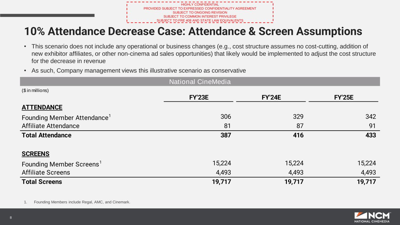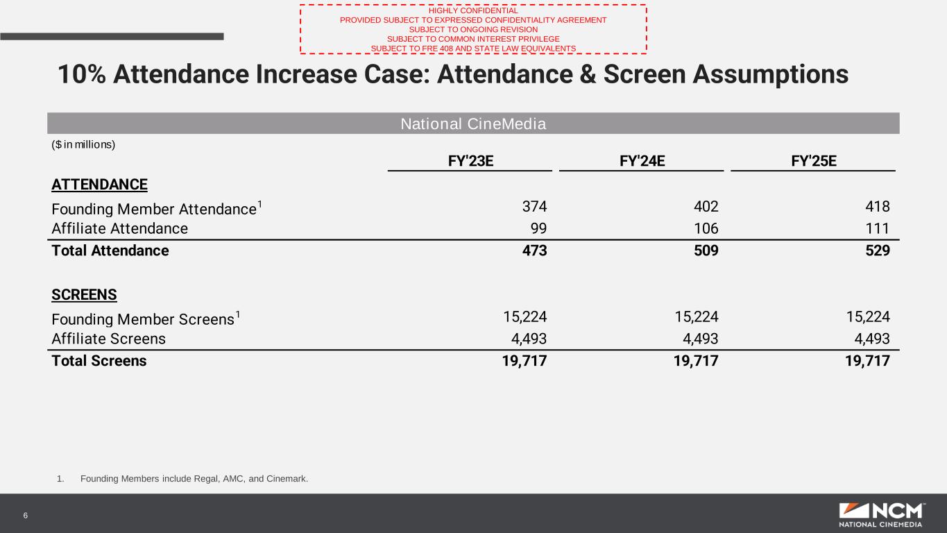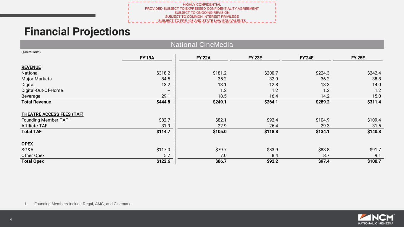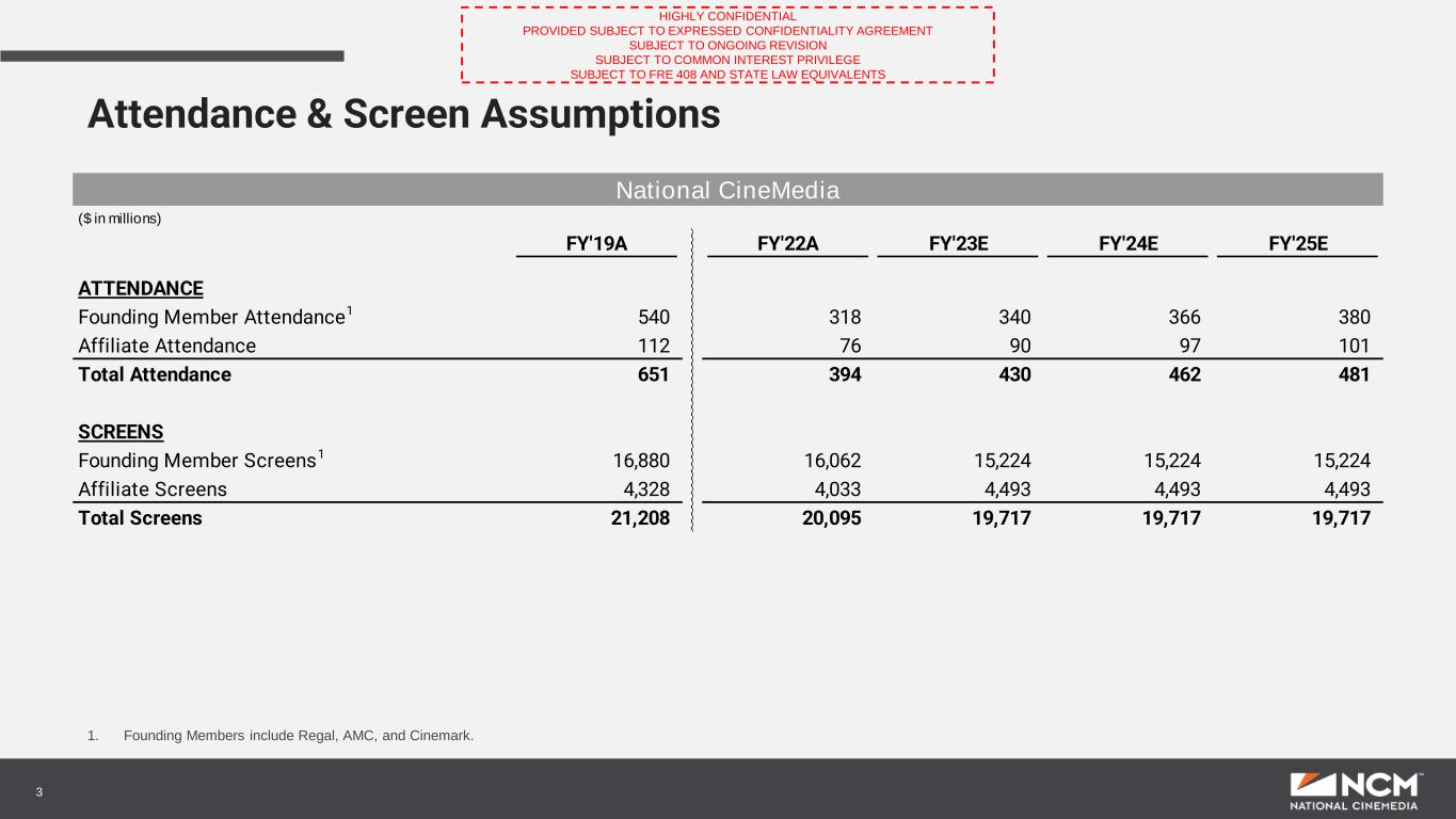HIGHLY CONFIDENTIAL PROVIDED SUBJECT TO EXPRESSED CONFIDENTIALITY AGREEMENT SUBJECT TO ONGOING REVISION SUBJECT TO COMMON INTEREST PRIVILEGE SUBJECT TO FRE 408 AND STATE LAW EQUIVALENTS Attendance & Screen Assumptions National CineMedia ($ in millions) FY'19A FY'22A FY'23E FY'24E FY'25E ATTENDANCE Founding Member Attendance1 540 318 340 366 380 Affiliate Attendance 112 76 90 97 101 Total Attendance 651 394 430 462 481 SCREENS Founding Member Screens1 16,880 16,062 15,224 15,224 15,224 Affiliate Screens 4,328 4,033 4,493 4,493 4,493 Total Screens 21,208 20,095 19,717 19,717 19,717 1. Founding Members include Regal, AMC, and Cinemark. 3