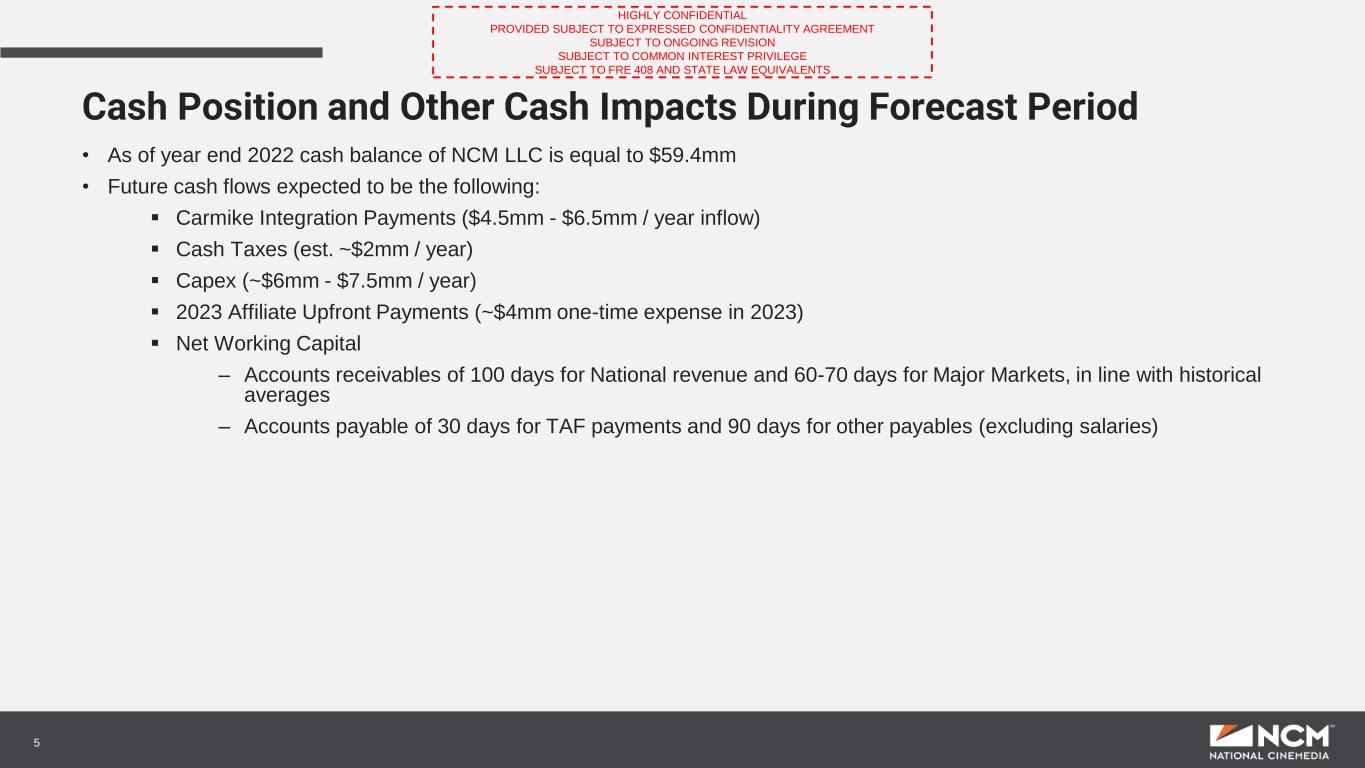 HIGHLY CONFIDENTIAL PROVIDED SUBJECT TO EXPRESSED CONFIDENTIALITY AGREEMENT SUBJECT TO ONGOING REVISION SUBJECT TO COMMON INTEREST PRIVILEGE SUBJECT TO FRE 408 AND STATE LAW EQUIVALENTS Financial Projections National CineMedia ($ in millions) FY'19A FY'22A FY'23E FY'24E FY'25E REVENUE National $318.2 $181.2 $200.7 $224.3 $242.4 Major Markets 84.5 35.2 32.9 36.2 38.8 Digital 13.2 13.1 12.8 13.3 14.0 Digital-Out-Of-Home -- 1.2 1.2 1.2 1.2 Beverage 29.1 18.5 16.4 14.2 15.0 Total Revenue $444.8 $249.1 $264.1 $289.2 $311.4 THEATRE ACCESS FEES (TAF) Founding Member TAF 1 $82.7 $82.1 $92.4 $104.9 $109.4 Affiliate TAF 31.9 22.9 26.4 29.3 31.5 Total TAF $114.7 $105.0 $118.8 $134.1 $140.8 OPEX SG&A $117.0 $79.7 $83.9 $88.8 $91.7 Other Opex 5.7 7.0 8.4 8.7 9.1 Total Opex $122.6 $86.7 $92.2 $97.4 $100.7 1. Founding Members include Regal, AMC, and Cinemark. 4