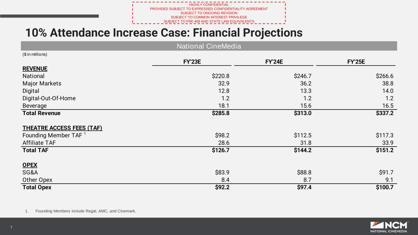 HIGHLY CONFIDENTIAL PROVIDED SUBJECT TO EXPRESSED CONFIDENTIALITY AGREEMENT SUBJECT TO ONGOING REVISION SUBJECT TO COMMON INTEREST PRIVILEGE SUBJECT TO FRE 408 AND STATE LAW EQUIVALENTS 10% Attendance Increase Case: Attendance & Screen Assumptions National CineMedia ($ in millions) FY'23E FY'24E FY'25E ATTENDANCE Founding Member Attendance1 374 402 418 Affiliate Attendance 99 106 111 Total Attendance 473 509 529 SCREENS Founding Member Screens1 15,224 15,224 15,224 Affiliate Screens 4,493 4,493 4,493 Total Screens 19,717 19,717 19,717 1. Founding Members include Regal, AMC, and Cinemark. 6