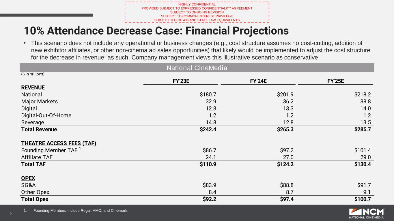 HIGHLY CONFIDENTIAL PROVIDED SUBJECT TO EXPRESSED CONFIDENTIALITY AGREEMENT SUBJECT TO ONGOING REVISION SUBJECT TO COMMON INTEREST PRIVILEGE SUBJECT TO FRE 408 AND STATE LAW EQUIVALENTS 10% Attendance Decrease Case: Financial Projections National CineMedia ($ in millions) FY'23E FY'24E FY'25E REVENUE National $180.7 $201.9 $218.2 Major Markets 32.9 36.2 38.8 Digital 12.8 13.3 14.0 Digital-Out-Of-Home 1.2 1.2 1.2 Beverage 14.8 12.8 13.5 Total Revenue $242.4 $265.3 $285.7 THEATRE ACCESS FEES (TAF) Founding Member TAF 1 $86.7 $97.2 $101.4 Affiliate TAF 24.1 27.0 29.0 Total TAF $110.9 $124.2 $130.4 OPEX SG&A $83.9 $88.8 $91.7 Other Opex 8.4 8.7 9.1 Total Opex $92.2 $97.4 $100.7 1. Founding Members include Regal, AMC, and Cinemark. 9 • This scenario does not include any operational or business changes (e.g., cost structure assumes no cost-cutting, addition of new exhibitor affiliates, or other non-cinema ad sales opportunities) that likely would be implemented to adjust the cost structure for the decrease in revenue; as such, Company management views this illustrative scenario as conservative