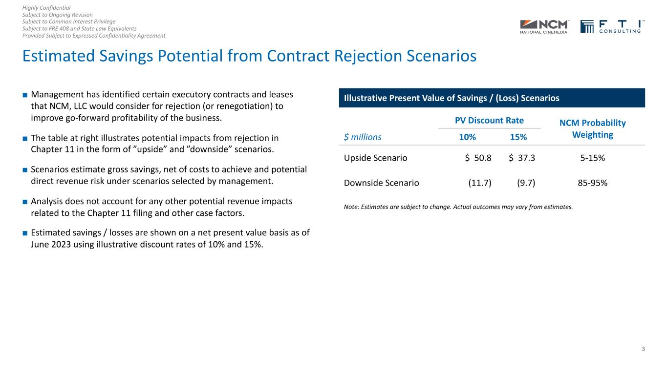 Highly Confidential Subject to Ongoing Revision Subject to Common Interest Privilege Subject to FRE 408 and State Law Equivalents Provided Subject to Expressed Confidentiality Agreement ■ Management has identified certain executory contracts and leases that NCM, LLC would consider for rejection (or renegotiation) to improve go-forward profitability of the business. ■ The table at right illustrates potential impacts from rejection in Chapter 11 in the form of ”upside” and ”downside” scenarios. ■ Scenarios estimate gross savings, net of costs to achieve and potential direct revenue risk under scenarios selected by management. ■ Analysis does not account for any other potential revenue impacts related to the Chapter 11 filing and other case factors. ■ Estimated savings / losses are shown on a net present value basis as of June 2023 using illustrative discount rates of 10% and 15%. Estimated Savings Potential from Contract Rejection Scenarios 3 PV Discount Rate NCM Probability Weighting$ millions 10% 15% Upside Scenario $ 50.8 $ 37.3 5-15% Downside Scenario (11.7) (9.7) 85-95% Illustrative Present Value of Savings / (Loss) Scenarios Note: Estimates are subject to change. Actual outcomes may vary from estimates.