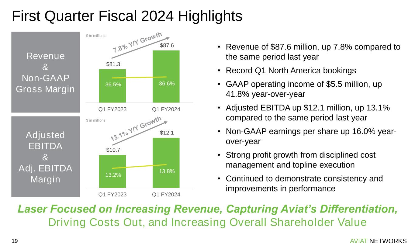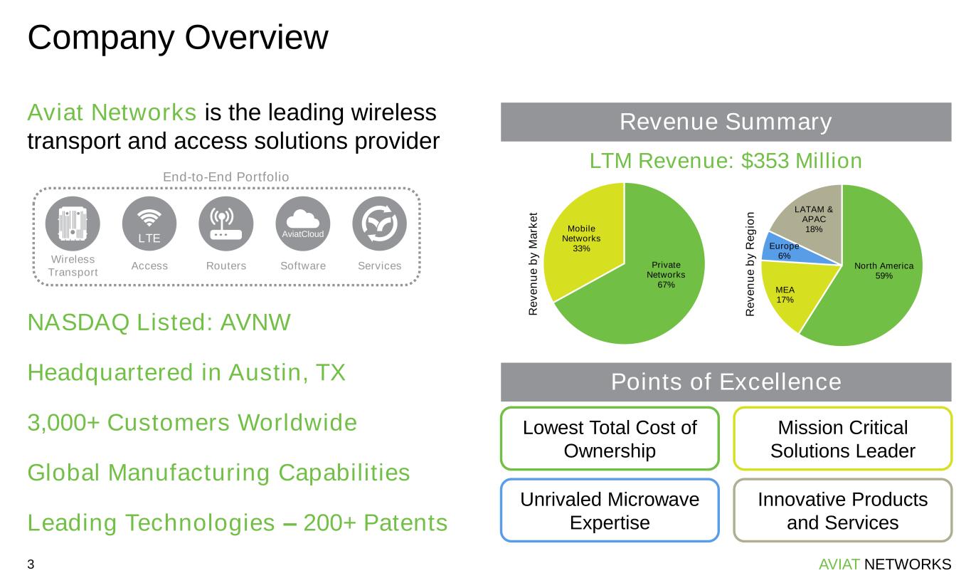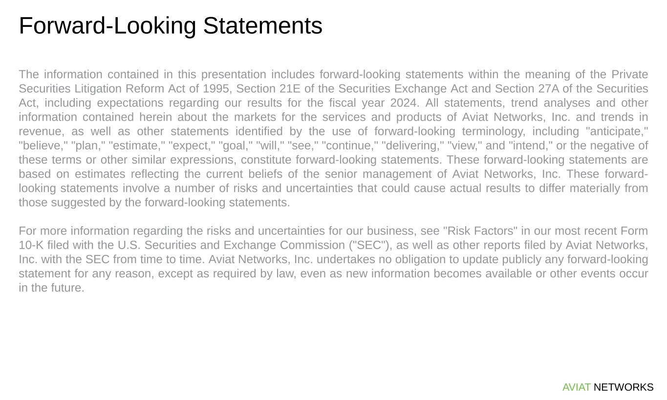 The information contained in this presentation includes forward-looking statements within the meaning of the Private Securities Litigation Reform Act of 1995, Section 21E of the Securities Exchange Act and Section 27A of the Securities Act, including expectations regarding our results for the fiscal year 2024. All statements, trend analyses and other information contained herein about the markets for the services and products of Aviat Networks, Inc. and trends in revenue, as well as other statements identified by the use of forward-looking terminology, including "anticipate," "believe," "plan," "estimate," "expect," "goal," "will," "see," "continue," "delivering," "view," and "intend," or the negative of these terms or other similar expressions, constitute forward-looking statements. These forward-looking statements are based on estimates reflecting the current beliefs of the senior management of Aviat Networks, Inc. These forward- looking statements involve a number of risks and uncertainties that could cause actual results to differ materially from those suggested by the forward-looking statements. For more information regarding the risks and uncertainties for our business, see "Risk Factors" in our most recent Form 10-K filed with the U.S. Securities and Exchange Commission ("SEC"), as well as other reports filed by Aviat Networks, Inc. with the SEC from time to time. Aviat Networks, Inc. undertakes no obligation to update publicly any forward-looking statement for any reason, except as required by law, even as new information becomes available or other events occur in the future. Forward-Looking Statements AVIAT NETWORKS