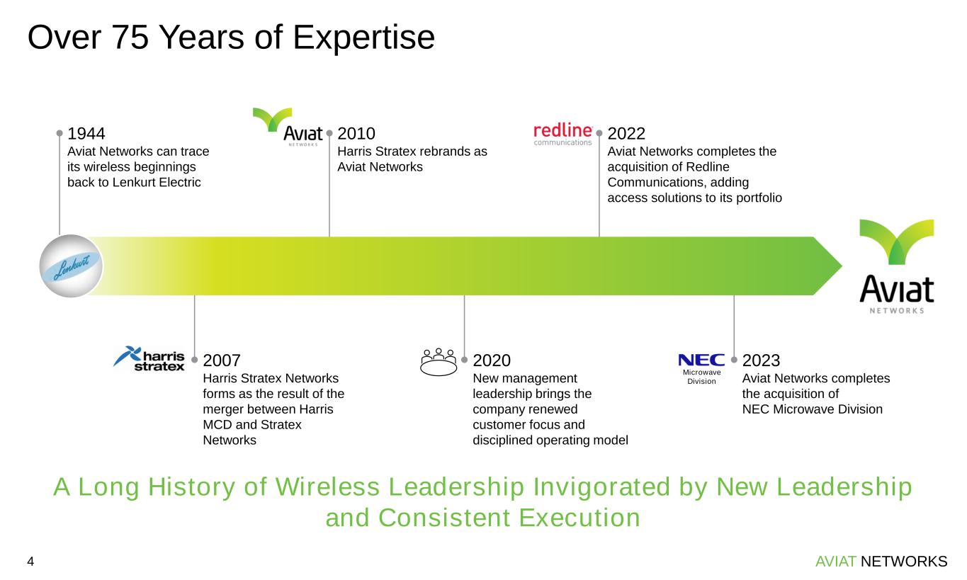 AVIAT NETWORKS Aviat Networks is the leading wireless transport and access solutions provider NASDAQ Listed: AVNW Headquartered in Austin, TX 3,000+ Customers Worldwide Global Manufacturing Capabilities Leading Technologies – 200+ Patents 3 Company Overview AviatCloudLTE Wireless Transport Access Routers Software Services End-to-End Portfolio North America 59% MEA 17% Europe 6% LATAM & APAC 18% Private Networks 67% Mobile Networks 33% R e v e n u e b y R e g io n R e v e n u e b y M a rk e t Revenue Summary Points of Excellence Lowest Total Cost of Ownership Mission Critical Solutions Leader Unrivaled Microwave Expertise Innovative Products and Services LTM Revenue: $353 Million