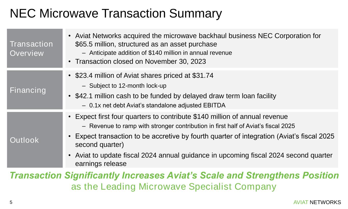 AVIAT NETWORKS4 A Long History of Wireless Leadership Invigorated by New Leadership and Consistent Execution Over 75 Years of Expertise 1944 Aviat Networks can trace its wireless beginnings back to Lenkurt Electric 2007 Harris Stratex Networks forms as the result of the merger between Harris MCD and Stratex Networks 2010 Harris Stratex rebrands as Aviat Networks 2020 New management leadership brings the company renewed customer focus and disciplined operating model 2022 Aviat Networks completes the acquisition of Redline Communications, adding access solutions to its portfolio 2023 Aviat Networks completes the acquisition of NEC Microwave Division Microwave Division