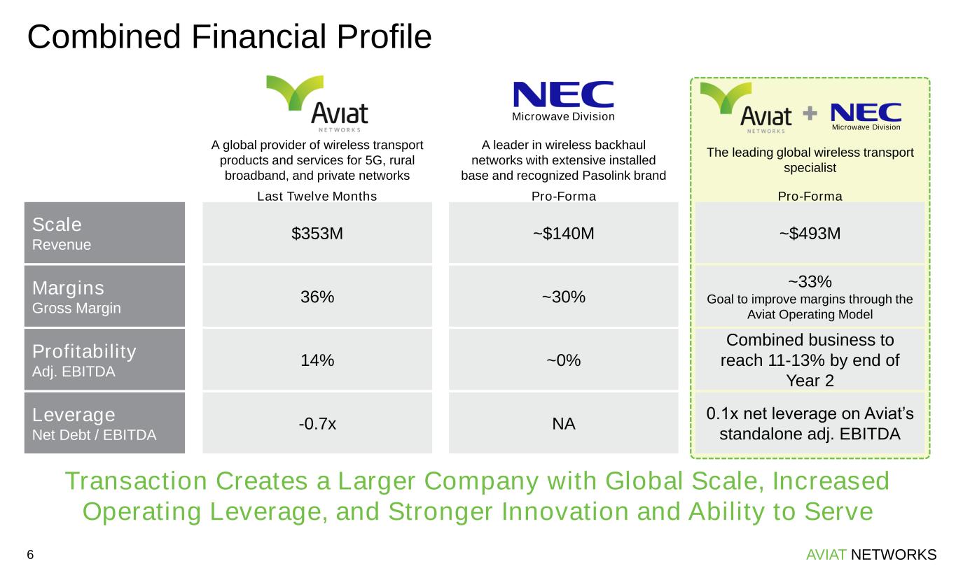 AVIAT NETWORKS5 Transaction Significantly Increases Aviat’s Scale and Strengthens Position as the Leading Microwave Specialist Company NEC Microwave Transaction Summary Transaction Overview Financing • Aviat Networks acquired the microwave backhaul business NEC Corporation for $65.5 million, structured as an asset purchase – Anticipate addition of $140 million in annual revenue • Transaction closed on November 30, 2023 • $23.4 million of Aviat shares priced at $31.74 – Subject to 12-month lock-up • $42.1 million cash to be funded by delayed draw term loan facility – 0.1x net debt Aviat’s standalone adjusted EBITDA Outlook • Expect first four quarters to contribute $140 million of annual revenue – Revenue to ramp with stronger contribution in first half of Aviat’s fiscal 2025 • Expect transaction to be accretive by fourth quarter of integration (Aviat’s fiscal 2025 second quarter) • Aviat to update fiscal 2024 annual guidance in upcoming fiscal 2024 second quarter earnings release