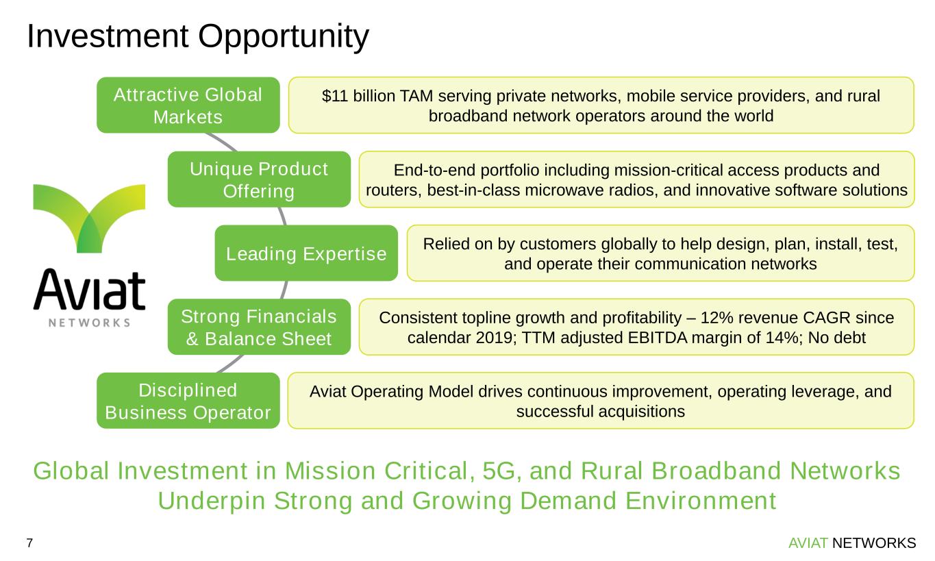 AVIAT NETWORKS6 Transaction Creates a Larger Company with Global Scale, Increased Operating Leverage, and Stronger Innovation and Ability to Serve Combined Financial Profile Scale Revenue $353M ~$140M Margins Gross Margin 36% ~30% Profitability Adj. EBITDA 14% ~0% A global provider of wireless transport products and services for 5G, rural broadband, and private networks A leader in wireless backhaul networks with extensive installed base and recognized Pasolink brand ~$493M ~33% Goal to improve margins through the Aviat Operating Model Combined business to reach 11-13% by end of Year 2 The leading global wireless transport specialist Leverage Net Debt / EBITDA -0.7x NA 0.1x net leverage on Aviat’s standalone adj. EBITDA Microwave Division Microwave Division Last Twelve Months Pro-Forma Pro-Forma