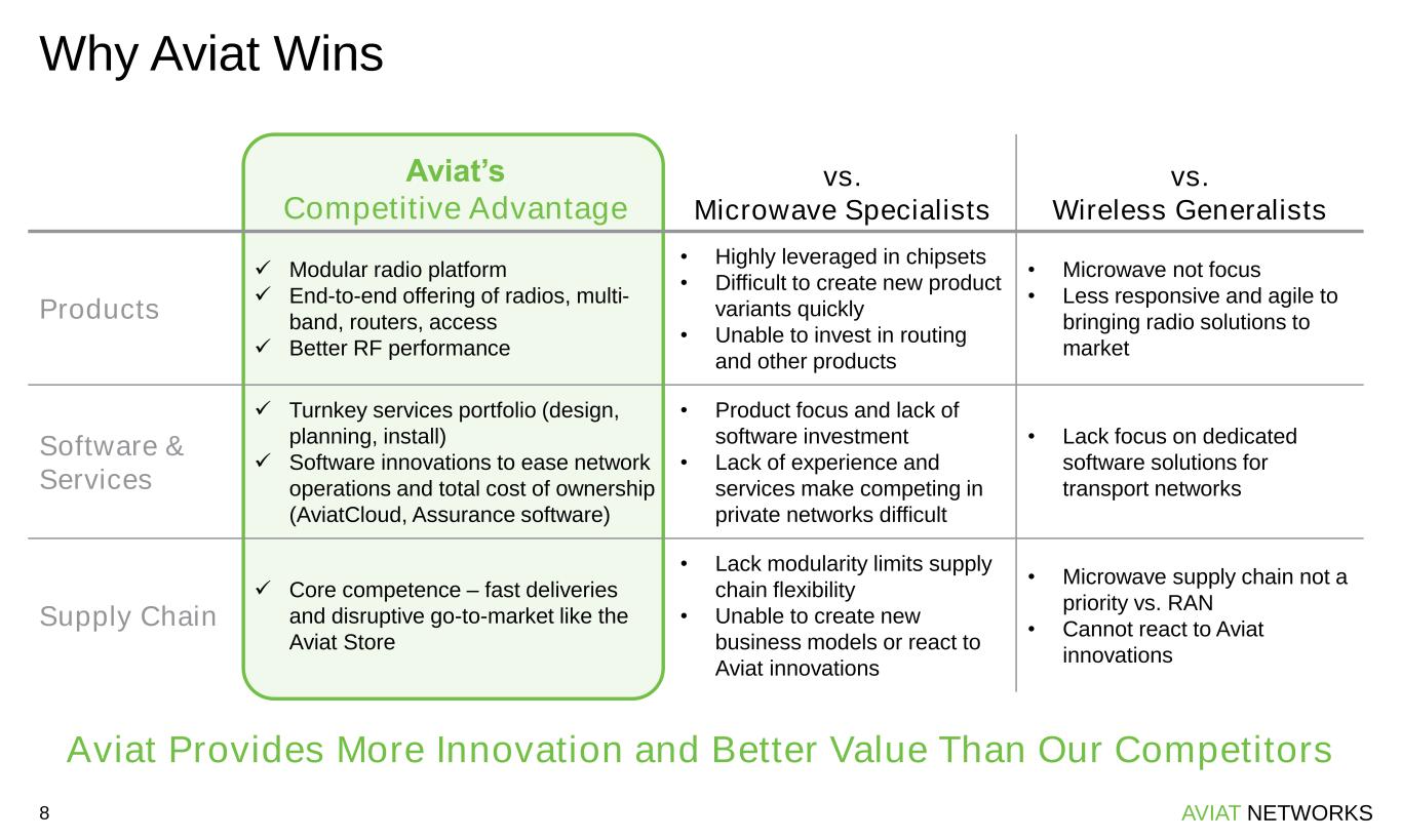 AVIAT NETWORKS Investment Opportunity 7 Global Investment in Mission Critical, 5G, and Rural Broadband Networks Underpin Strong and Growing Demand Environment $11 billion TAM serving private networks, mobile service providers, and rural broadband network operators around the world End-to-end portfolio including mission-critical access products and routers, best-in-class microwave radios, and innovative software solutions Relied on by customers globally to help design, plan, install, test, and operate their communication networks Consistent topline growth and profitability – 12% revenue CAGR since calendar 2019; TTM adjusted EBITDA margin of 14%; No debt Aviat Operating Model drives continuous improvement, operating leverage, and successful acquisitions Attractive Global Markets Unique Product Offering Leading Expertise Strong Financials & Balance Sheet Disciplined Business Operator