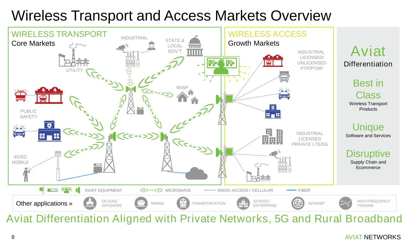 AVIAT NETWORKS Aviat’s Competitive Advantage vs. Microwave Specialists vs. Wireless Generalists Products ✓ Modular radio platform ✓ End-to-end offering of radios, multi- band, routers, access ✓ Better RF performance • Highly leveraged in chipsets • Difficult to create new product variants quickly • Unable to invest in routing and other products • Microwave not focus • Less responsive and agile to bringing radio solutions to market Software & Services ✓ Turnkey services portfolio (design, planning, install) ✓ Software innovations to ease network operations and total cost of ownership (AviatCloud, Assurance software) • Product focus and lack of software investment • Lack of experience and services make competing in private networks difficult • Lack focus on dedicated software solutions for transport networks Supply Chain ✓ Core competence – fast deliveries and disruptive go-to-market like the Aviat Store • Lack modularity limits supply chain flexibility • Unable to create new business models or react to Aviat innovations • Microwave supply chain not a priority vs. RAN • Cannot react to Aviat innovations 8 Aviat Provides More Innovation and Better Value Than Our Competitors Why Aviat Wins