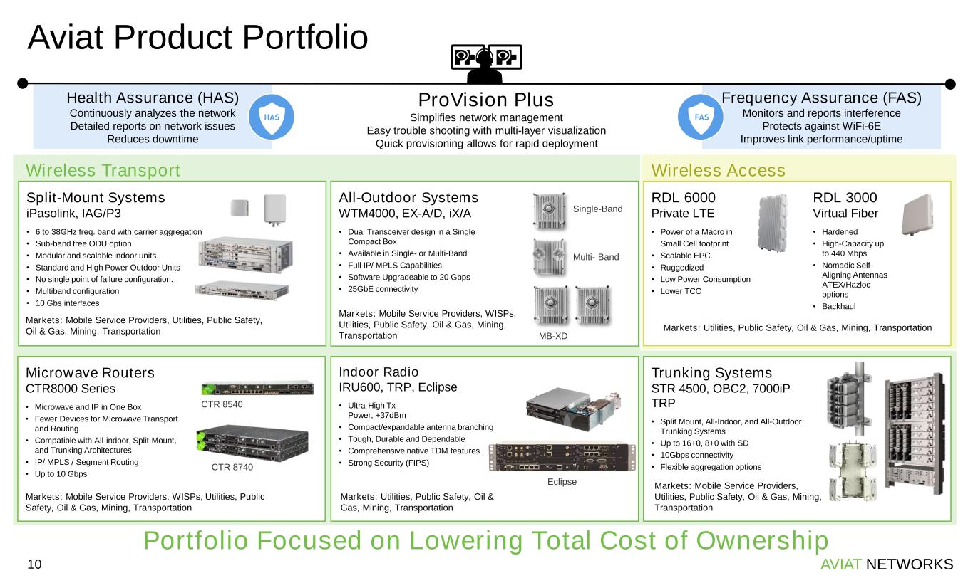 AVIAT NETWORKS Wireless Transport and Access Markets Overview 9 Aviat Differentiation Aligned with Private Networks, 5G and Rural Broadband WIRELESS ACCESS Growth Markets STATE & LOCAL GOV’T UTILITY PUBLIC SAFETY 4G/5G MOBILE WIRELESS TRANSPORT Core Markets INDUSTRIAL LICENSED/ UNLICENSED PTP/PTMP INDUSTRIAL LICENSED PRIVATE LTE/5G FIBERRADIO ACCESS / CELLULAR Other applications » INDUSTRIAL MICROWAVE Aviat Differentiation Best in Class Wireless Transport Products Unique Software and Services Disruptive Supply Chain and Ecommerce HIGH FREQUENCY TRADING SCHOOL/ ENTERPRISE OIL/GAS/ OFFSHORE TRANSPORTATION ISP/WISPMINING AVIAT EQUIPMENT WISP