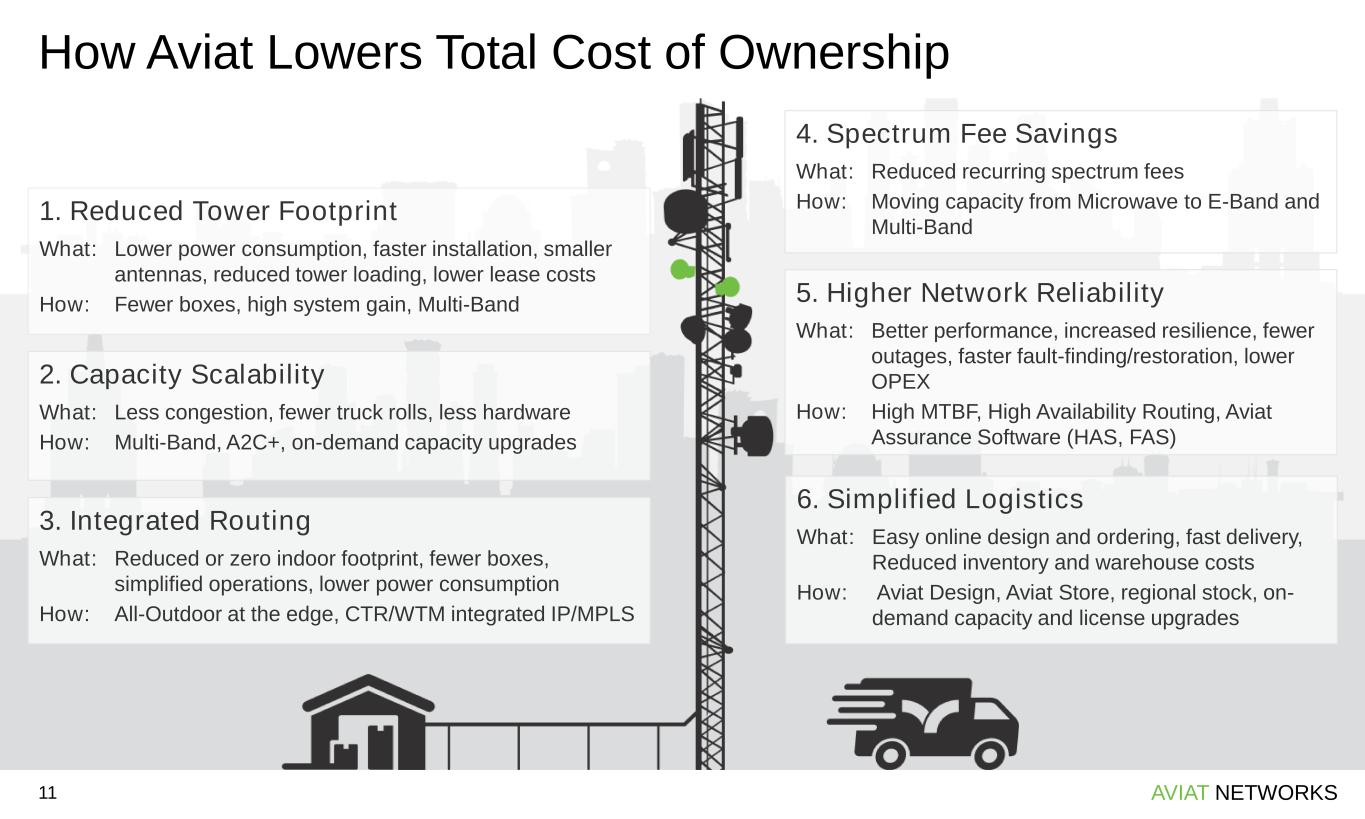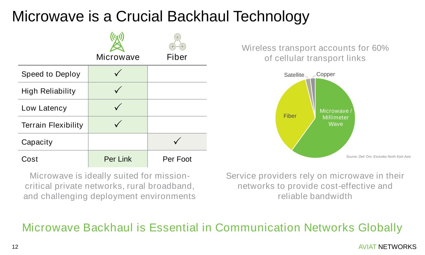 AVIAT NETWORKS How Aviat Lowers Total Cost of Ownership 11 1. Reduced Tower Footprint What: Lower power consumption, faster installation, smaller antennas, reduced tower loading, lower lease costs How: Fewer boxes, high system gain, Multi-Band 2. Capacity Scalability What: Less congestion, fewer truck rolls, less hardware How: Multi-Band, A2C+, on-demand capacity upgrades 3. Integrated Routing What: Reduced or zero indoor footprint, fewer boxes, simplified operations, lower power consumption How: All-Outdoor at the edge, CTR/WTM integrated IP/MPLS 4. Spectrum Fee Savings What: Reduced recurring spectrum fees How: Moving capacity from Microwave to E-Band and Multi-Band 5. Higher Network Reliability What: Better performance, increased resilience, fewer outages, faster fault-finding/restoration, lower OPEX How: High MTBF, High Availability Routing, Aviat Assurance Software (HAS, FAS) 6. Simplified Logistics What: Easy online design and ordering, fast delivery, Reduced inventory and warehouse costs How: Aviat Design, Aviat Store, regional stock, on- demand capacity and license upgrades
