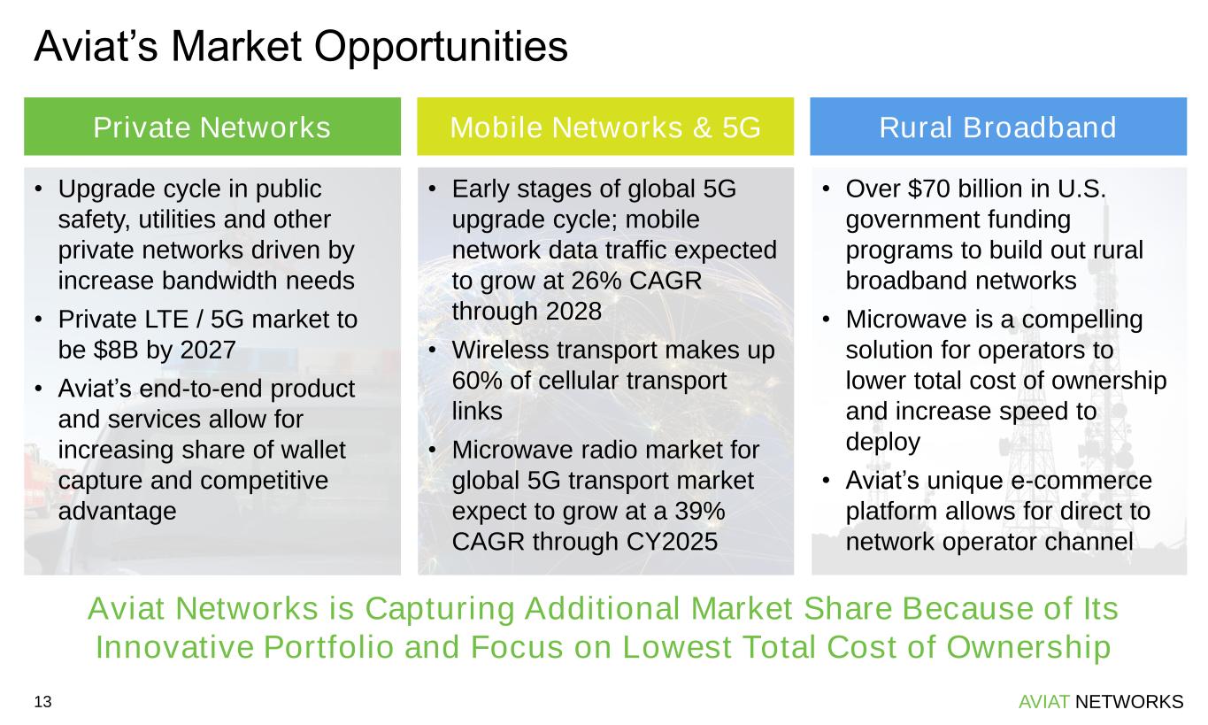 AVIAT NETWORKS Microwave is a Crucial Backhaul Technology 12 Microwave Fiber Speed to Deploy  High Reliability  Low Latency  Terrain Flexibility  Capacity  Cost Per Link Per Foot Microwave / Millimeter Wave Fiber Satellite Copper Microwave Backhaul is Essential in Communication Networks Globally Wireless transport accounts for 60% of cellular transport links Source: Dell ‘Oro; Excludes North East Asia Microwave is ideally suited for mission- critical private networks, rural broadband, and challenging deployment environments Service providers rely on microwave in their networks to provide cost-effective and reliable bandwidth
