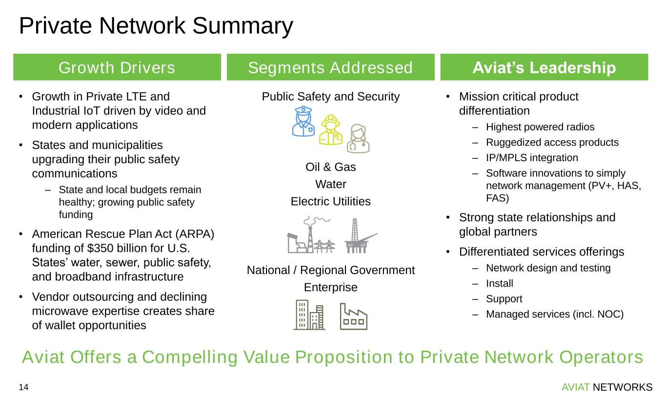 AVIAT NETWORKS • Upgrade cycle in public safety, utilities and other private networks driven by increase bandwidth needs • Private LTE / 5G market to be $8B by 2027 • Aviat’s end-to-end product and services allow for increasing share of wallet capture and competitive advantage Aviat’s Market Opportunities 13 Aviat Networks is Capturing Additional Market Share Because of Its Innovative Portfolio and Focus on Lowest Total Cost of Ownership Private Networks Mobile Networks & 5G Rural Broadband • Early stages of global 5G upgrade cycle; mobile network data traffic expected to grow at 26% CAGR through 2028 • Wireless transport makes up 60% of cellular transport links • Microwave radio market for global 5G transport market expect to grow at a 39% CAGR through CY2025 • Over $70 billion in U.S. government funding programs to build out rural broadband networks • Microwave is a compelling solution for operators to lower total cost of ownership and increase speed to deploy • Aviat’s unique e-commerce platform allows for direct to network operator channel