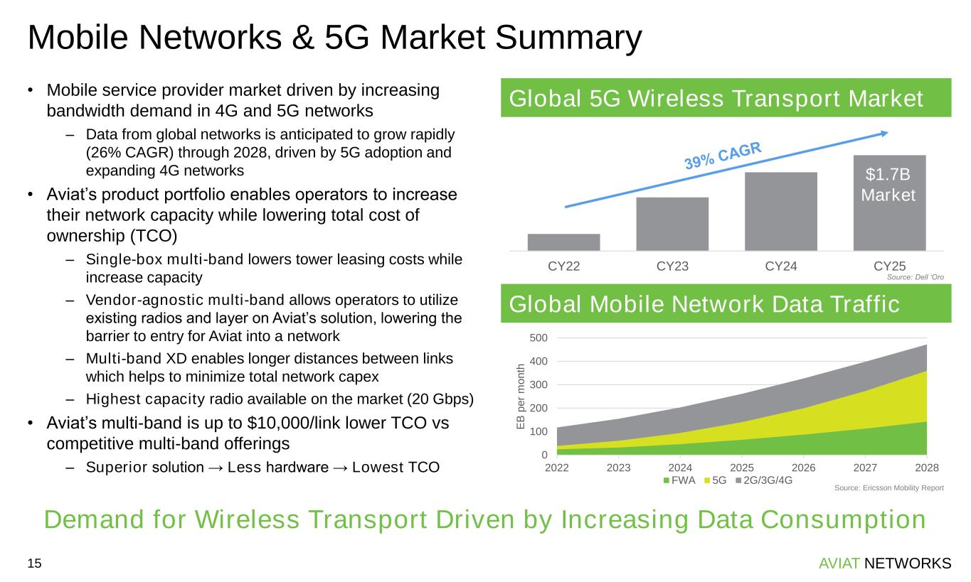 AVIAT NETWORKS Public Safety and Security Oil & Gas Water Electric Utilities National / Regional Government Enterprise Private Network Summary 14 • Growth in Private LTE and Industrial IoT driven by video and modern applications • States and municipalities upgrading their public safety communications – State and local budgets remain healthy; growing public safety funding • American Rescue Plan Act (ARPA) funding of $350 billion for U.S. States’ water, sewer, public safety, and broadband infrastructure • Vendor outsourcing and declining microwave expertise creates share of wallet opportunities Aviat Offers a Compelling Value Proposition to Private Network Operators Growth Drivers Segments Addressed • Mission critical product differentiation – Highest powered radios – Ruggedized access products – IP/MPLS integration – Software innovations to simply network management (PV+, HAS, FAS) • Strong state relationships and global partners • Differentiated services offerings – Network design and testing – Install – Support – Managed services (incl. NOC) Aviat’s Leadership