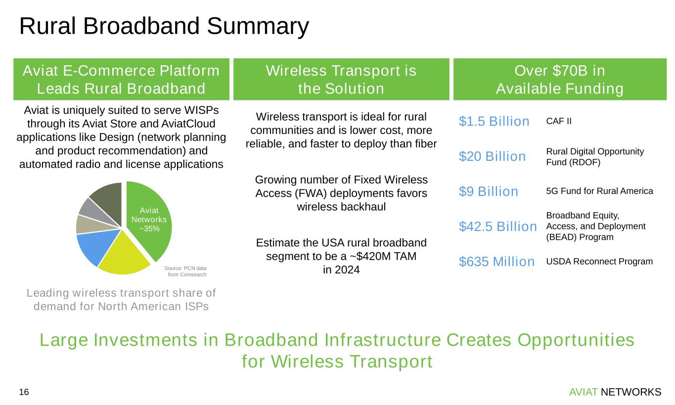 AVIAT NETWORKS Mobile Networks & 5G Market Summary 15 • Mobile service provider market driven by increasing bandwidth demand in 4G and 5G networks – Data from global networks is anticipated to grow rapidly (26% CAGR) through 2028, driven by 5G adoption and expanding 4G networks • Aviat’s product portfolio enables operators to increase their network capacity while lowering total cost of ownership (TCO) – Single-box multi-band lowers tower leasing costs while increase capacity – Vendor-agnostic multi-band allows operators to utilize existing radios and layer on Aviat’s solution, lowering the barrier to entry for Aviat into a network – Multi-band XD enables longer distances between links which helps to minimize total network capex – Highest capacity radio available on the market (20 Gbps) • Aviat’s multi-band is up to $10,000/link lower TCO vs competitive multi-band offerings – Superior solution → Less hardware → Lowest TCO CY22 CY23 CY24 CY25 Demand for Wireless Transport Driven by Increasing Data Consumption Global 5G Wireless Transport Market Source: Dell ‘Oro 0 100 200 300 400 500 2022 2023 2024 2025 2026 2027 2028 E B p e r m o n th FWA 5G 2G/3G/4G $1.7B Market Global Mobile Network Data Traffic Source: Ericsson Mobility Report