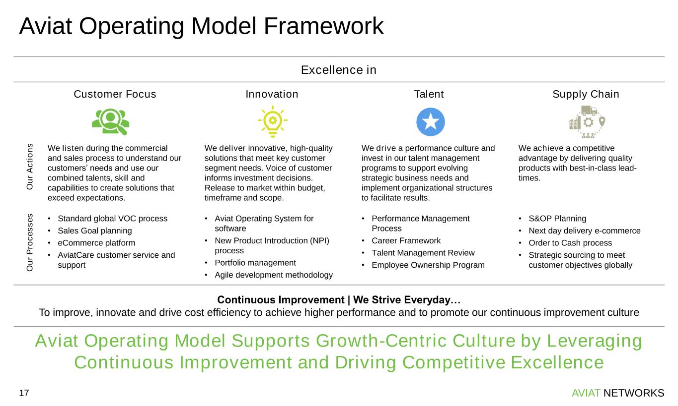 AVIAT NETWORKS17 Aviat Operating Model Supports Growth-Centric Culture by Leveraging Continuous Improvement and Driving Competitive Excellence Aviat Operating Model Framework Excellence in Customer Focus Innovation Talent Supply Chain O u r A c ti o n s We listen during the commercial and sales process to understand our customers’ needs and use our combined talents, skill and capabilities to create solutions that exceed expectations. We deliver innovative, high-quality solutions that meet key customer segment needs. Voice of customer informs investment decisions. Release to market within budget, timeframe and scope. We drive a performance culture and invest in our talent management programs to support evolving strategic business needs and implement organizational structures to facilitate results. We achieve a competitive advantage by delivering quality products with best-in-class lead- times. O u r P ro c e s s e s • Standard global VOC process • Sales Goal planning • eCommerce platform • AviatCare customer service and support • Aviat Operating System for software • New Product Introduction (NPI) process • Portfolio management • Agile development methodology • Performance Management Process • Career Framework • Talent Management Review • Employee Ownership Program • S&OP Planning • Next day delivery e-commerce • Order to Cash process • Strategic sourcing to meet customer objectives globally Continuous Improvement | We Strive Everyday… To improve, innovate and drive cost efficiency to achieve higher performance and to promote our continuous improvement culture
