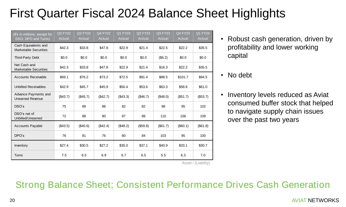 AVIAT NETWORKS $10.7 $12.1 13.2% 13.8% 10.0% 11.0% 12.0% 13.0% 14.0% 15.0% 16.0% 17.0% 18.0% 19.0% 20.0% $8.0 $8.5 $9.0 $9.5 $10.0 $10.5 $11.0 $11.5 $12.0 $12.5 $13.0 Q1 FY2023 Q1 FY2024 $81.3 $87.6 36.5% 36.6% 34.0% 35.0% 36.0% 37.0% 38.0% 39.0% 40.0% $70.0 $72.0 $74.0 $76.0 $78.0 $80.0 $82.0 $84.0 $86.0 $88.0 $90.0 Q1 FY2023 Q1 FY2024 First Quarter Fiscal 2024 Highlights 19 • Revenue of $87.6 million, up 7.8% compared to the same period last year • Record Q1 North America bookings • GAAP operating income of $5.5 million, up 41.8% year-over-year • Adjusted EBITDA up $12.1 million, up 13.1% compared to the same period last year • Non-GAAP earnings per share up 16.0% year- over-year • Strong profit growth from disciplined cost management and topline execution • Continued to demonstrate consistency and improvements in performance Laser Focused on Increasing Revenue, Capturing Aviat’s Differentiation, Driving Costs Out, and Increasing Overall Shareholder Value Revenue & Non-GAAP Gross Margin Adjusted EBITDA & Adj. EBITDA Margin $ in millions $ in millions