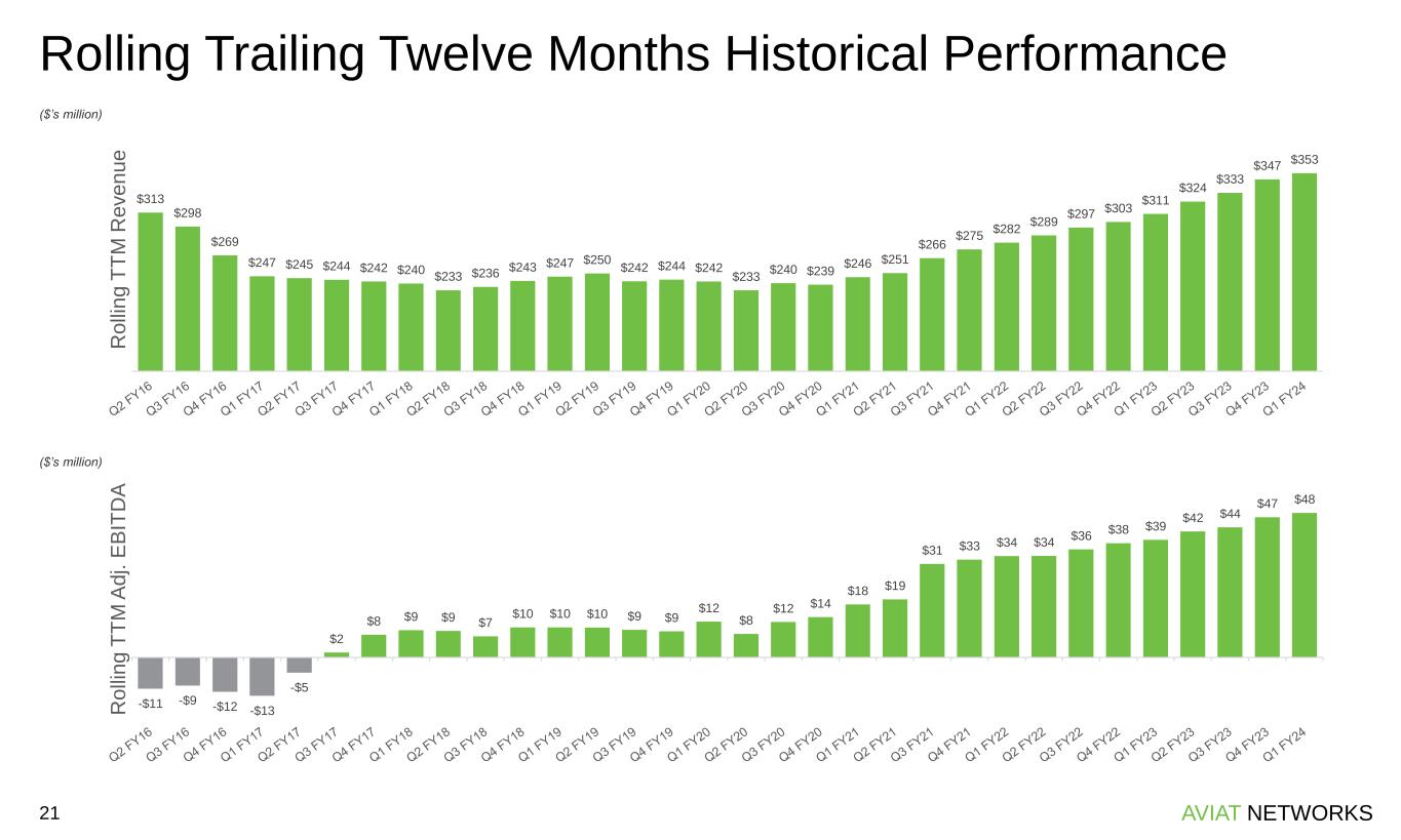 AVIAT NETWORKS First Quarter Fiscal 2024 Balance Sheet Highlights 20 • Robust cash generation, driven by profitability and lower working capital • No debt • Inventory levels reduced as Aviat consumed buffer stock that helped to navigate supply chain issues over the past two years Strong Balance Sheet; Consistent Performance Drives Cash Generation Asset / (Liability) Q2 FY22 Q3 FY22 Q4 FY22 Q1 FY23 Q2 FY23 Q3 FY23 Q4 FY23 Q1 FY24 Actual Actual Actual Actual Actual Actual Actual Actual Cash Equivalents and Marketable Securities $42.3 $33.8 $47.8 $22.9 $21.4 $22.5 $22.2 $35.5 Third-Party Debt $0.0 $0.0 $0.0 $0.0 $0.0 ($6.2) $0.0 $0.0 Net Cash and Marketable Securities $42.3 $33.8 $47.8 $22.9 $21.4 $16.3 $22.2 $35.5 Accounts Receivable $69.1 $76.2 $73.2 $72.5 $91.4 $88.5 $101.7 $94.5 Unbilled Receivables $42.9 $45.7 $45.9 $50.4 $53.6 $63.3 $58.6 $61.0 Advance Payments and Unearned Revenue ($43.7) ($45.7) ($42.7) ($43.3) ($46.7) ($48.0) ($51.7) ($53.7) DSO’s 75 89 88 82 82 98 95 102 DSO’s net of Unbilled/Unearned 72 88 90 87 89 110 106 109 Accounts Payable ($43.5) ($40.6) ($42.4) ($48.2) ($59.8) ($61.7) ($60.1) ($61.8) DPO’s 76 81 76 80 84 103 95 100 Inventory $27.4 $30.5 $27.2 $35.0 $37.1 $40.9 $33.1 $30.7 Turns 7.5 6.5 6.9 6.7 6.5 5.5 6.3 7.0 ($’s in millions, except for DSO, DPO and Turns)