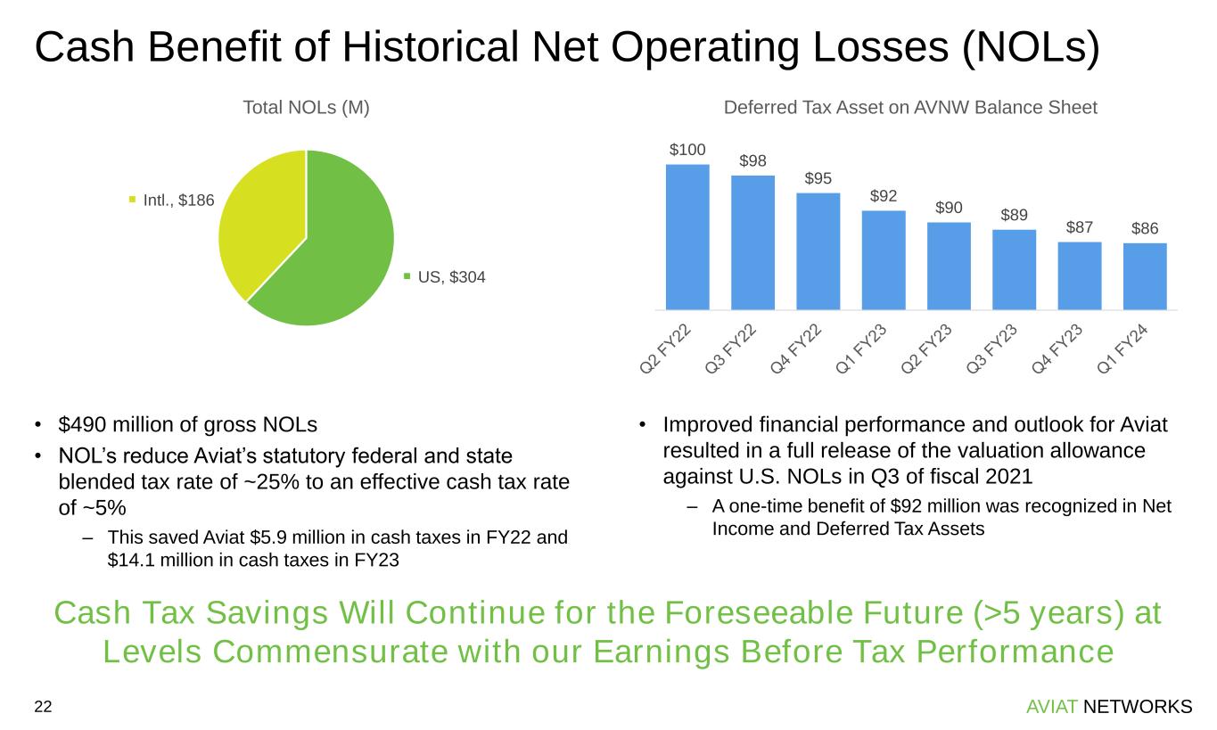 AVIAT NETWORKS Cash Benefit of Historical Net Operating Losses (NOLs) 22 Cash Tax Savings Will Continue for the Foreseeable Future (>5 years) at Levels Commensurate with our Earnings Before Tax Performance • $490 million of gross NOLs • NOL’s reduce Aviat’s statutory federal and state blended tax rate of ~25% to an effective cash tax rate of ~5% – This saved Aviat $5.9 million in cash taxes in FY22 and $14.1 million in cash taxes in FY23 • Improved financial performance and outlook for Aviat resulted in a full release of the valuation allowance against U.S. NOLs in Q3 of fiscal 2021 – A one-time benefit of $92 million was recognized in Net Income and Deferred Tax Assets US, $304 Intl., $186 Total NOLs (M) $100 $98 $95 $92 $90 $89 $87 $86 Deferred Tax Asset on AVNW Balance Sheet