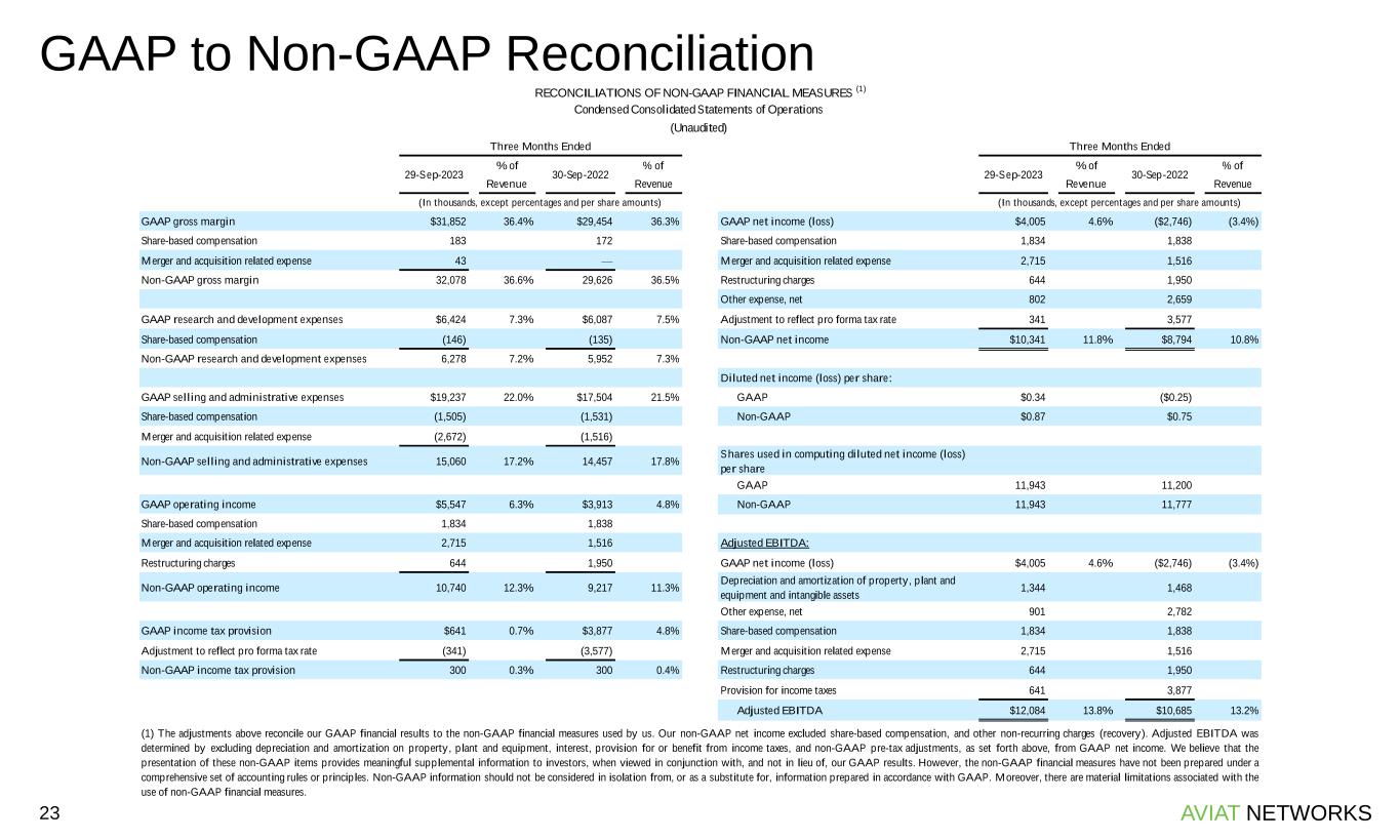 AVIAT NETWORKS23 GAAP to Non-GAAP Reconciliation RECONCILIATIONS OF NON-GAAP FINANCIAL MEASURES (1) Condensed Consolidated Statements of Operations (Unaudited) % of % of % of % of Revenue Revenue Revenue Revenue GAAP gross margin $31,852 36.4% $29,454 36.3% GAAP net income (loss) $4,005 4.6% ($2,746) (3.4%) Share-based compensation 183 172 Share-based compensation 1,834 1,838 Merger and acquisition related expense 43 — Merger and acquisition related expense 2,715 1,516 Non-GAAP gross margin 32,078 36.6% 29,626 36.5% Restructuring charges 644 1,950 Other expense, net 802 2,659 GAAP research and development expenses $6,424 7.3% $6,087 7.5% Adjustment to reflect pro forma tax rate 341 3,577 Share-based compensation (146) (135) Non-GAAP net income $10,341 11.8% $8,794 10.8% Non-GAAP research and development expenses 6,278 7.2% 5,952 7.3% Diluted net income (loss) per share: GAAP selling and administrative expenses $19,237 22.0% $17,504 21.5% GAAP $0.34 ($0.25) Share-based compensation (1,505) (1,531) Non-GAAP $0.87 $0.75 Merger and acquisition related expense (2,672) (1,516) Non-GAAP selling and administrative expenses 15,060 17.2% 14,457 17.8% Shares used in computing diluted net income (loss) per share GAAP 11,943 11,200 GAAP operating income $5,547 6.3% $3,913 4.8% Non-GAAP 11,943 11,777 Share-based compensation 1,834 1,838 Merger and acquisition related expense 2,715 1,516 Adjusted EBITDA: Restructuring charges 644 1,950 GAAP net income (loss) $4,005 4.6% ($2,746) (3.4%) Non-GAAP operating income 10,740 12.3% 9,217 11.3% Depreciation and amortization of property, plant and equipment and intangible assets 1,344 1,468 Other expense, net 901 2,782 GAAP income tax provision $641 0.7% $3,877 4.8% Share-based compensation 1,834 1,838 Adjustment to reflect pro forma tax rate (341) (3,577) Merger and acquisition related expense 2,715 1,516 Non-GAAP income tax provision 300 0.3% 300 0.4% Restructuring charges 644 1,950 Provision for income taxes 641 3,877 Adjusted EBITDA $12,084 13.8% $10,685 13.2% (1) The adjustments above reconcile our GAAP financial results to the non-GAAP financial measures used by us. Our non-GAAP net income excluded share-based compensation, and other non-recurring charges (recovery). Adjusted EBITDA was determined by excluding depreciation and amortization on property, plant and equipment, interest, provision for or benefit from income taxes, and non-GAAP pre-tax adjustments, as set forth above, from GAAP net income. We believe that the presentation of these non-GAAP items provides meaningful supplemental information to investors, when viewed in conjunction with, and not in lieu of, our GAAP results. However, the non-GAAP financial measures have not been prepared under a comprehensive set of accounting rules or principles. Non-GAAP information should not be considered in isolation from, or as a substitute for, information prepared in accordance with GAAP. Moreover, there are material limitations associated with the use of non-GAAP financial measures. (In thousands, except percentages and per share amounts) Three Months Ended 29-Sep-2023 30-Sep-2022 (In thousands, except percentages and per share amounts) Three Months Ended 29-Sep-2023 30-Sep-2022
