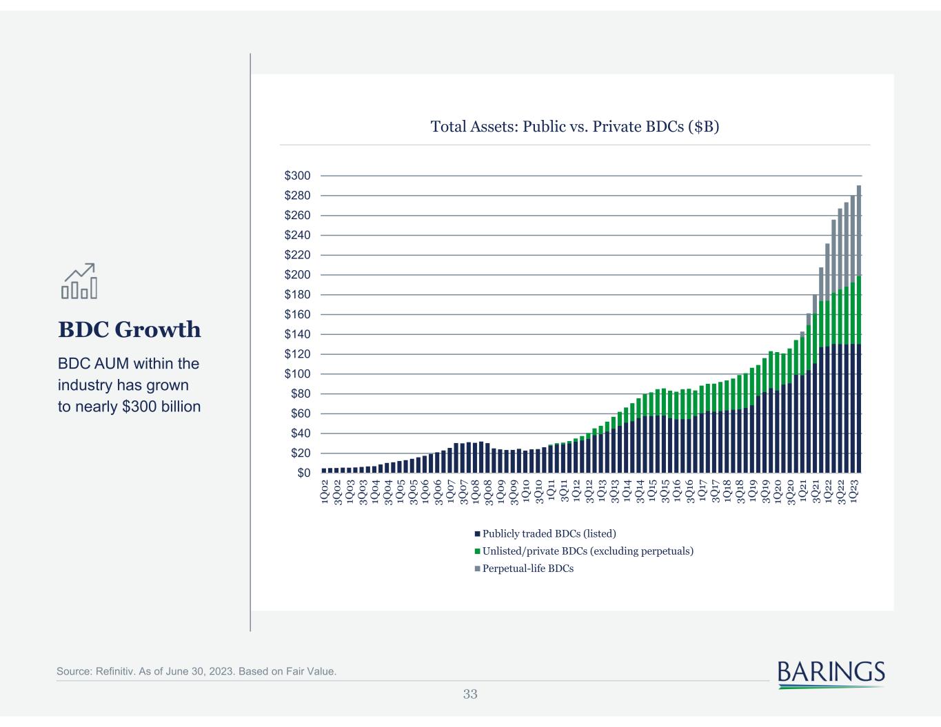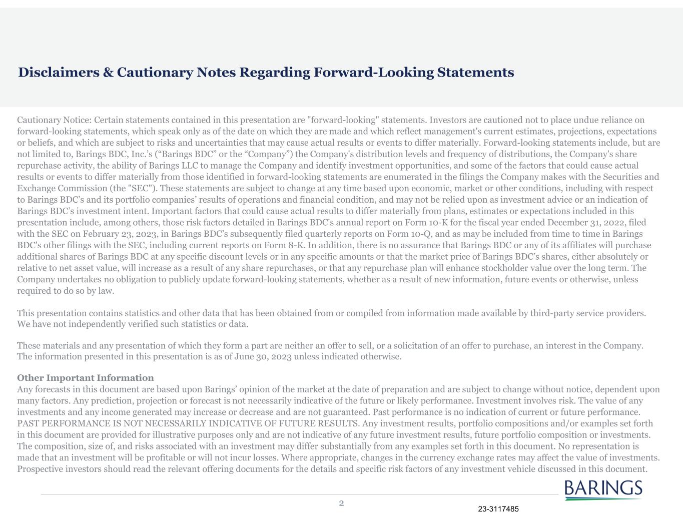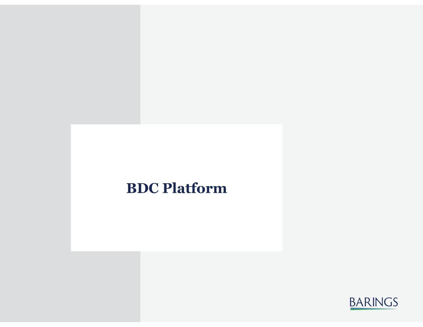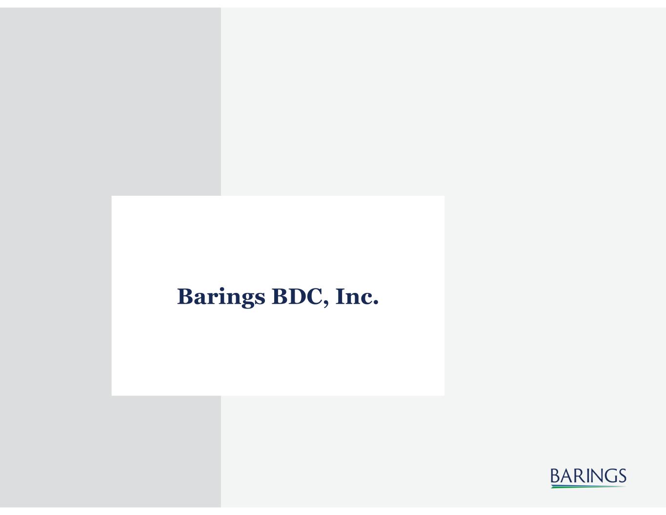 2 Disclaimers & Cautionary Notes Regarding Forward-Looking Statements Cautionary Notice: Certain statements contained in this presentation are "forward-looking" statements. Investors are cautioned not to place undue reliance on forward-looking statements, which speak only as of the date on which they are made and which reflect management's current estimates, projections, expectations or beliefs, and which are subject to risks and uncertainties that may cause actual results or events to differ materially. Forward-looking statements include, but are not limited to, Barings BDC, Inc.’s (“Barings BDC” or the “Company”) the Company's distribution levels and frequency of distributions, the Company's share repurchase activity, the ability of Barings LLC to manage the Company and identify investment opportunities, and some of the factors that could cause actual results or events to differ materially from those identified in forward-looking statements are enumerated in the filings the Company makes with the Securities and Exchange Commission (the "SEC"). These statements are subject to change at any time based upon economic, market or other conditions, including with respect to Barings BDC’s and its portfolio companies’ results of operations and financial condition, and may not be relied upon as investment advice or an indication of Barings BDC’s investment intent. Important factors that could cause actual results to differ materially from plans, estimates or expectations included in this presentation include, among others, those risk factors detailed in Barings BDC's annual report on Form 10-K for the fiscal year ended December 31, 2022, filed with the SEC on February 23, 2023, in Barings BDC’s subsequently filed quarterly reports on Form 10-Q, and as may be included from time to time in Barings BDC's other filings with the SEC, including current reports on Form 8-K. In addition, there is no assurance that Barings BDC or any of its affiliates will purchase additional shares of Barings BDC at any specific discount levels or in any specific amounts or that the market price of Barings BDC’s shares, either absolutely or relative to net asset value, will increase as a result of any share repurchases, or that any repurchase plan will enhance stockholder value over the long term. The Company undertakes no obligation to publicly update forward-looking statements, whether as a result of new information, future events or otherwise, unless required to do so by law. This presentation contains statistics and other data that has been obtained from or compiled from information made available by third-party service providers. We have not independently verified such statistics or data. These materials and any presentation of which they form a part are neither an offer to sell, or a solicitation of an offer to purchase, an interest in the Company. The information presented in this presentation is as of June 30, 2023 unless indicated otherwise. Other Important Information Any forecasts in this document are based upon Barings’ opinion of the market at the date of preparation and are subject to change without notice, dependent upon many factors. Any prediction, projection or forecast is not necessarily indicative of the future or likely performance. Investment involves risk. The value of any investments and any income generated may increase or decrease and are not guaranteed. Past performance is no indication of current or future performance. PAST PERFORMANCE IS NOT NECESSARILY INDICATIVE OF FUTURE RESULTS. Any investment results, portfolio compositions and/or examples set forth in this document are provided for illustrative purposes only and are not indicative of any future investment results, future portfolio composition or investments. The composition, size of, and risks associated with an investment may differ substantially from any examples set forth in this document. No representation is made that an investment will be profitable or will not incur losses. Where appropriate, changes in the currency exchange rates may affect the value of investments. Prospective investors should read the relevant offering documents for the details and specific risk factors of any investment vehicle discussed in this document. 23-3117485
