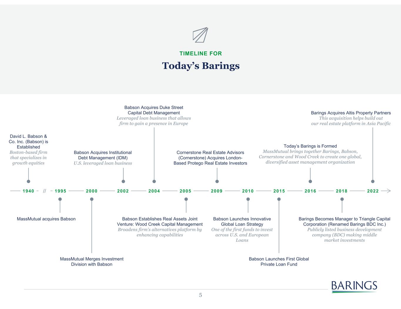 4 EXTERNAL AUM BY REGION1 43% 27% 30% Americas Asia Pacific EMEAInvestment Offices Global Headquarters Other Locations 1. Includes third party, external AUM only. All figures are as of June 30, 2023 unless otherwise indicated. Assets shown are denominated in USD. Percentages may not equal 100 due to rounding. Who We Are Barings, a subsidiary of MassMutual, is a global investment manager sourcing differentiated opportunities and building portfolios across public and private fixed income, real estate and specialist equity markets BARINGS OVERVIEW $351+ B ASSETS UNDER MANAGEMENT 1,200+ EXTERNAL CLIENTS 1,800+ PROFESSIONALS GLOBALLY